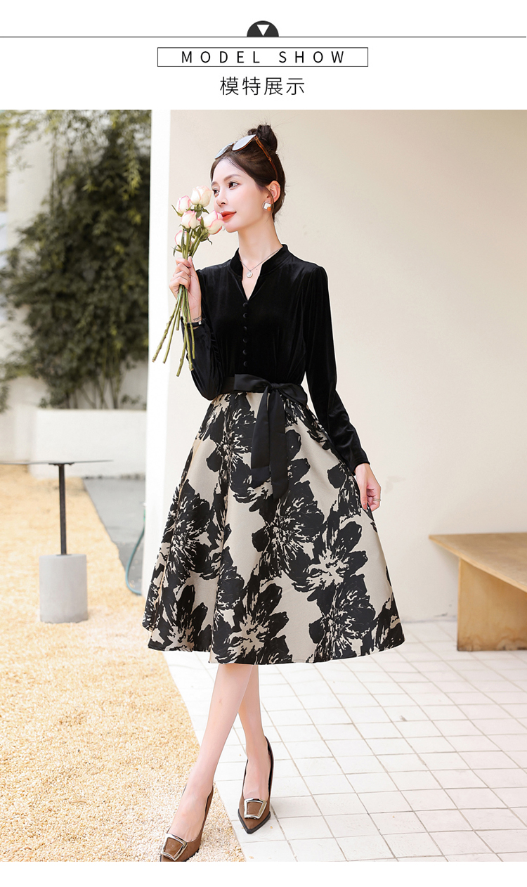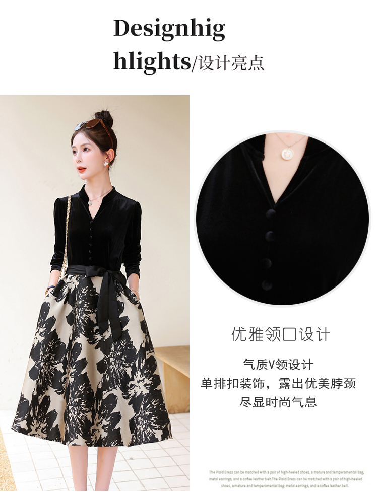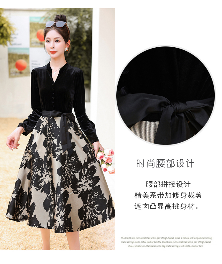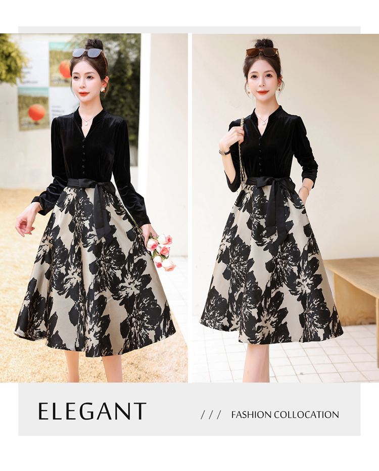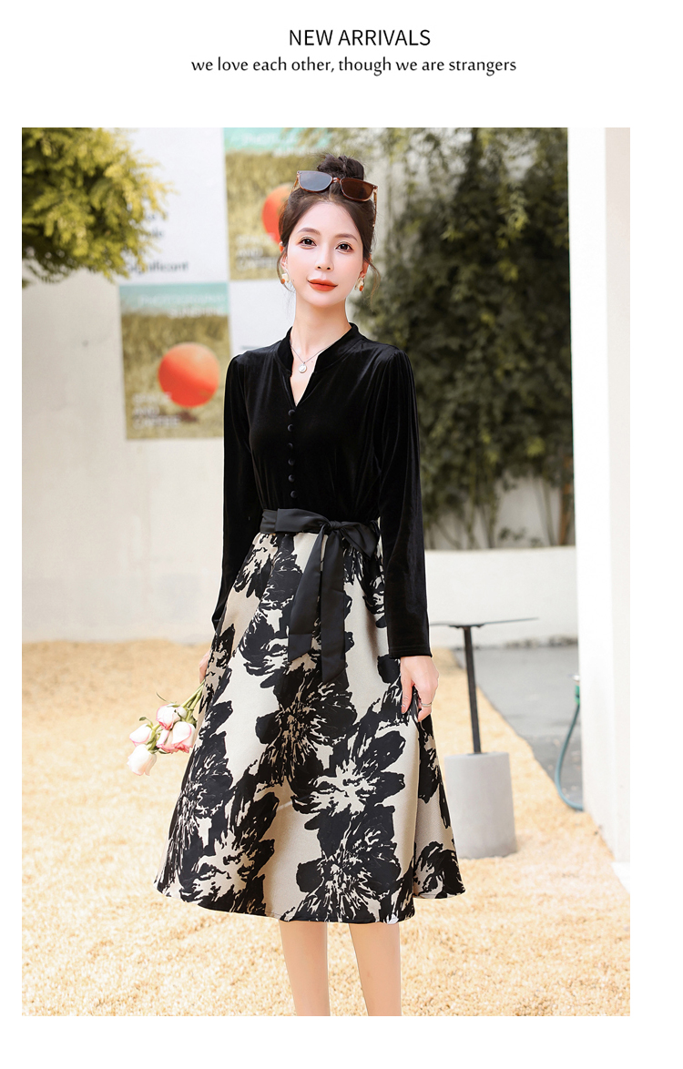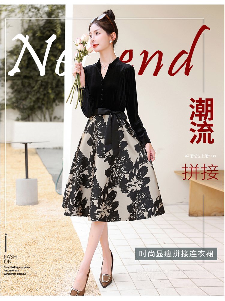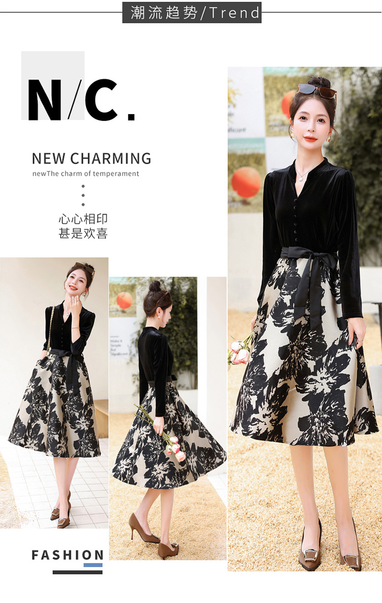 秋季新款,拼接单排多扣优雅气质水墨花朵显瘦长款连衣裙HR-JNFGN2805