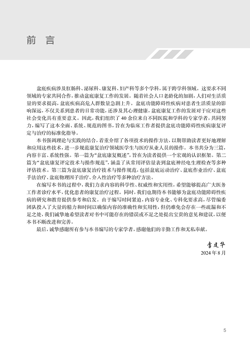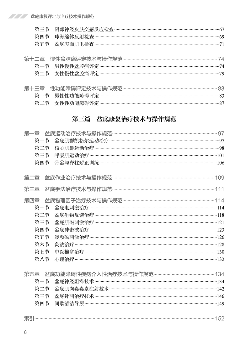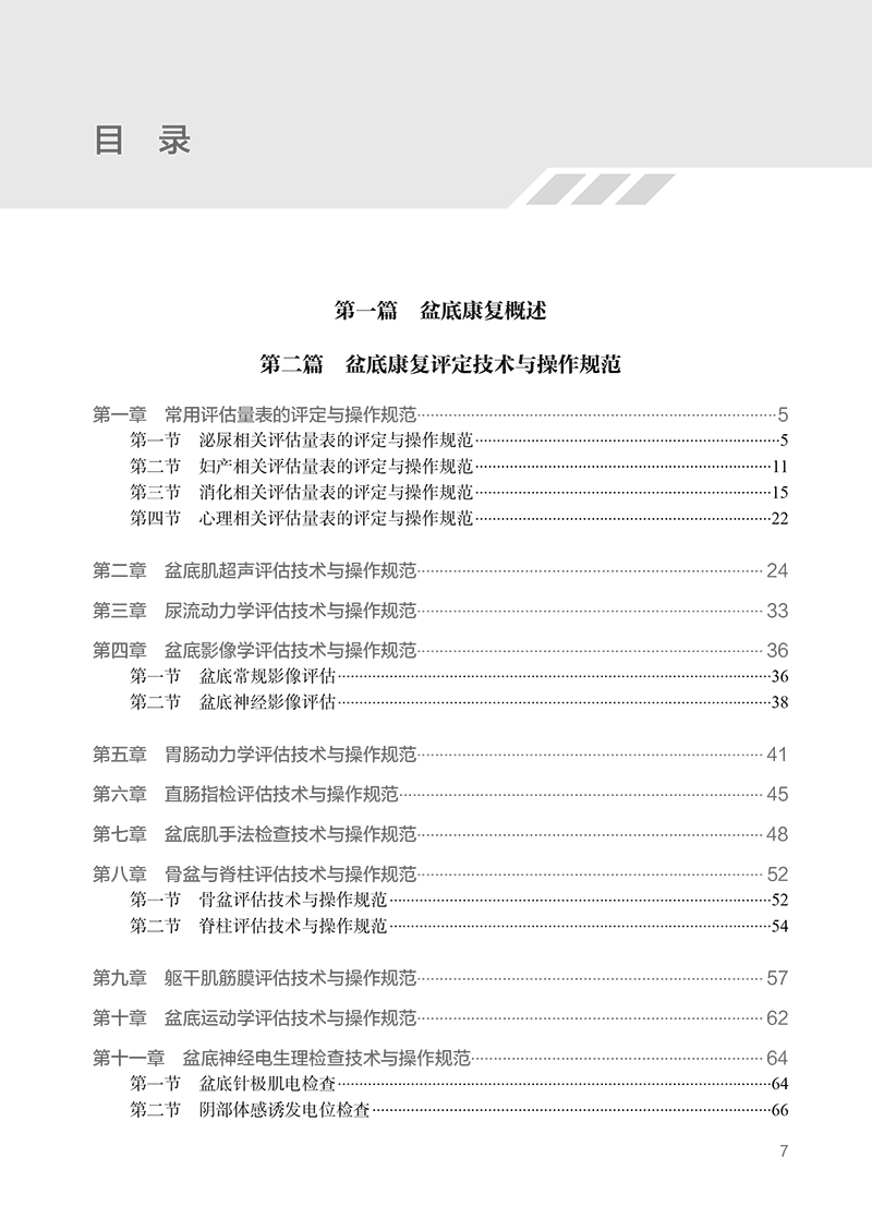 第一篇 盆底康复概述 第二篇 盆底康复评定技术与操作规范 第一章 常用评估量表的评定与操作规范/5 第一节 泌尿相关评估量表的评定与操作规范 /5 第二节 妇产相关评估量表的评定与操作规范 /11 第三节 消化相关评估量表的评定与操作规范 /15 第四节 心理相关评估量表的评定与操作规范 /22 第二章 盆底肌超声评估技术与操作规范/ 24 第三章 尿流动力学评估技术与操作规范/ 33 第四章 盆底影像学评估技术与操作规范/ 36 第一节 盆底常规影像评估 /36 第二节 盆底神经影像评估 /38 第五章 胃肠动力学评估技术与操作规范/ 41 第六章 直肠指检评估技术与操作规范/ 45 第七章 盆底肌手法检查技术与操作规范/ 48 第八章 骨盆与脊柱评估技术与操作规范/ 52 第一节 骨盆评估技术与操作规范 /52 第二节 脊柱评估技术与操作规范 /54 第九章 躯干肌筋膜评估技术与操作规范/ 57 第十章 盆底运动学评估技术与操作规范/ 62 第十一章 盆底神经电生理检查技术与操作规范/ 64 第一节 盆底针极肌电检查 /64 第二节 阴部体感诱发电位检查 /66 第三节 阴部神经皮肤交感反应检查 /67 第四节 球海绵体反射检查 /69 第五节 盆底表面肌电检查 /71 第十二章 慢性盆腔痛评定技术与操作规范/ 74 第一节 男性慢性盆腔痛评定 /74 第二节 女性慢性盆腔痛评定 /79 第十三章 性功能障碍评定技术与操作规范/ 83 第一节 男性性功能障碍评定 /83 第二节 女性性功能障碍评定 /87 第三篇 盆底康复治疗技术与操作规范 第一章 盆底运动治疗技术与操作规范/ 97 第一节 盆底肌群凯格尔运动治疗 /97 第二节 核心肌群运动治疗 /98 第三节 呼吸肌运动治疗 /101 第四节 骨盆与脊柱矫正训练 /106 第二章 盆底作业治疗技术与操作规范/109 第三章 盆底手法治疗技术与操作规范/111 第四章 盆底物理因子治疗技术与操作规范/114 第一节 盆底电刺激治疗 /114 第二节 盆底生物反馈治疗 /118 第三节 盆底肌磁刺激治疗 /121 第四节 盆底冲击波治疗 /123 第五节 经颅磁刺激治疗 /126 第六节 灸法治疗 /128 第七节 中医推拿治疗 /130 第八节 心理治疗 /132 第五章 盆底功能障碍性疾病介入性治疗技术与操作规范/134 第一节 盆底神经阻滞技术 /134 第二节 盆底肌肉毒毒素注射技术 /142 第三节 盆底针刺治疗技术 /146 第四节 间歇清洁导尿 /149 索引/152