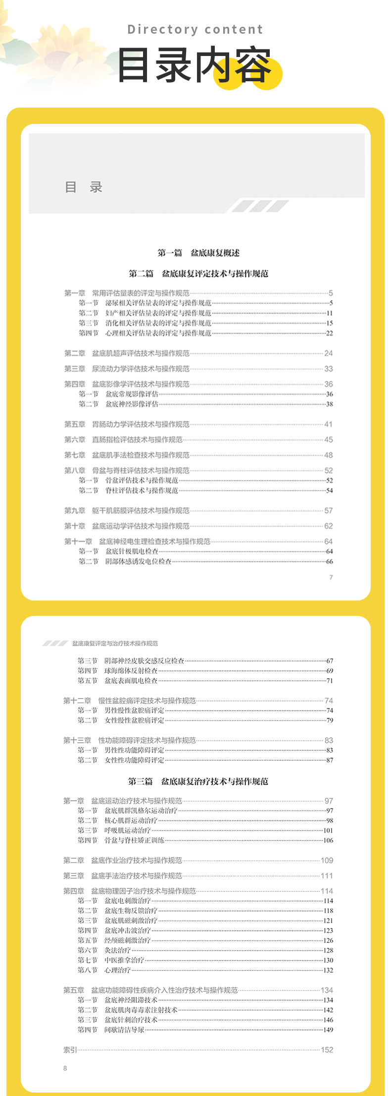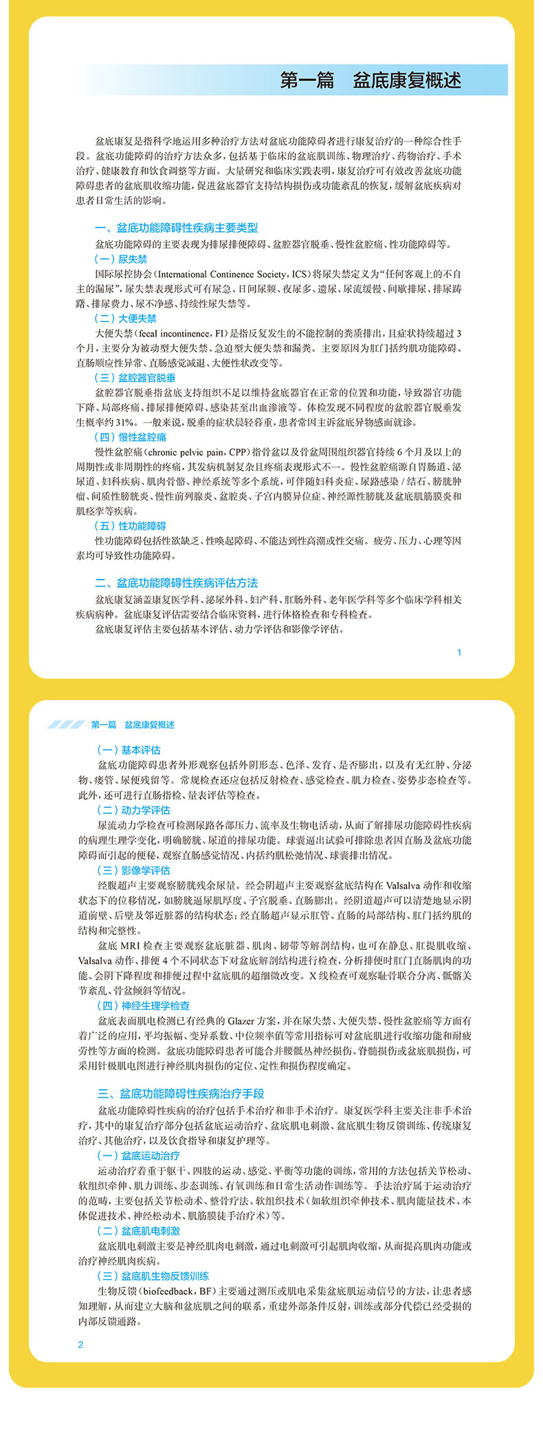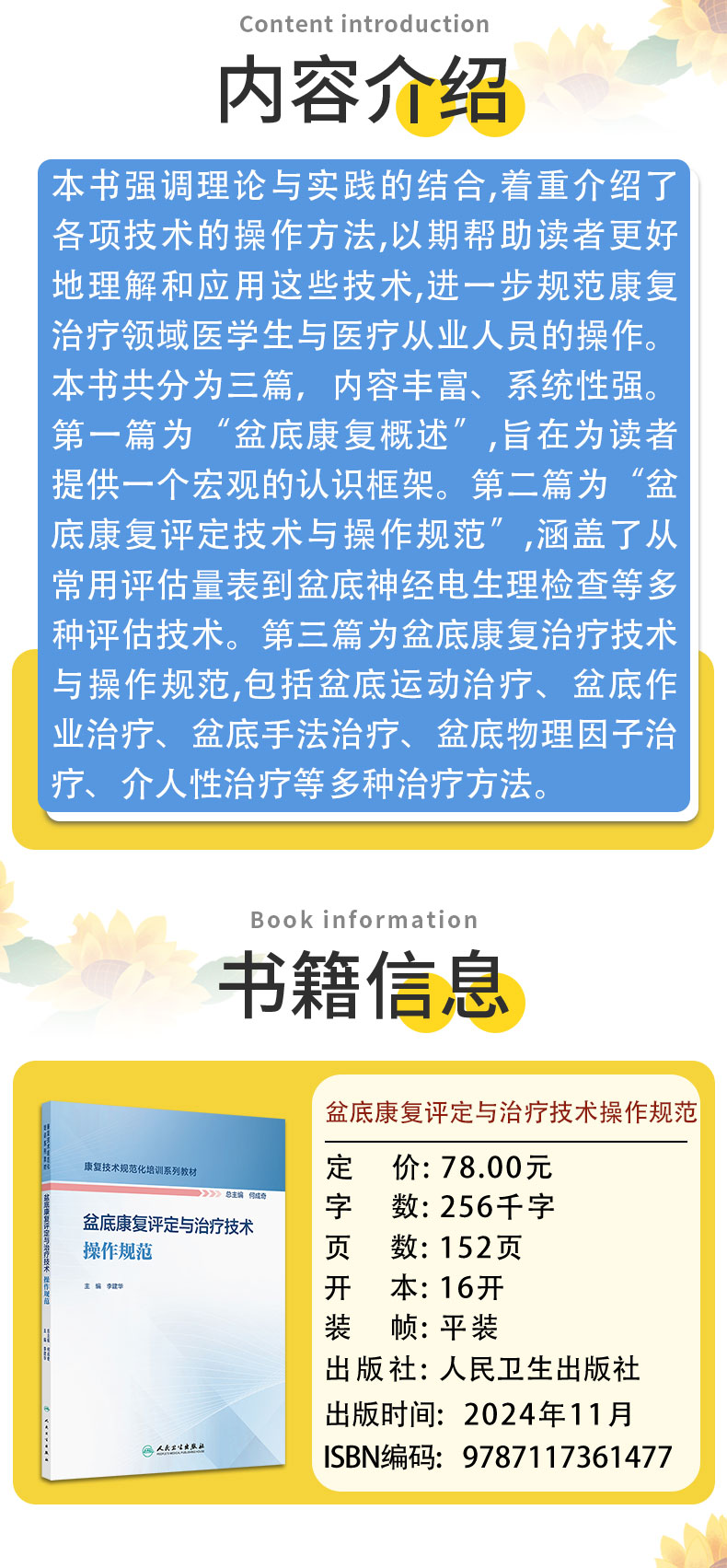 第一篇 盆底康复概述 第二篇 盆底康复评定技术与操作规范 第一章 常用评估量表的评定与操作规范/5 第一节 泌尿相关评估量表的评定与操作规范 /5 第二节 妇产相关评估量表的评定与操作规范 /11 第三节 消化相关评估量表的评定与操作规范 /15 第四节 心理相关评估量表的评定与操作规范 /22 第二章 盆底肌超声评估技术与操作规范/ 24 第三章 尿流动力学评估技术与操作规范/ 33 第四章 盆底影像学评估技术与操作规范/ 36 第一节 盆底常规影像评估 /36 第二节 盆底神经影像评估 /38 第五章 胃肠动力学评估技术与操作规范/ 41 第六章 直肠指检评估技术与操作规范/ 45 第七章 盆底肌手法检查技术与操作规范/ 48 第八章 骨盆与脊柱评估技术与操作规范/ 52 第一节 骨盆评估技术与操作规范 /52 第二节 脊柱评估技术与操作规范 /54 第九章 躯干肌筋膜评估技术与操作规范/ 57 第十章 盆底运动学评估技术与操作规范/ 62 第十一章 盆底神经电生理检查技术与操作规范/ 64 第一节 盆底针极肌电检查 /64 第二节 阴部体感诱发电位检查 /66 第三节 阴部神经皮肤交感反应检查 /67 第四节 球海绵体反射检查 /69 第五节 盆底表面肌电检查 /71 第十二章 慢性盆腔痛评定技术与操作规范/ 74 第一节 男性慢性盆腔痛评定 /74 第二节 女性慢性盆腔痛评定 /79 第十三章 性功能障碍评定技术与操作规范/ 83 第一节 男性性功能障碍评定 /83 第二节 女性性功能障碍评定 /87 第三篇 盆底康复治疗技术与操作规范 第一章 盆底运动治疗技术与操作规范/ 97 第一节 盆底肌群凯格尔运动治疗 /97 第二节 核心肌群运动治疗 /98 第三节 呼吸肌运动治疗 /101 第四节 骨盆与脊柱矫正训练 /106 第二章 盆底作业治疗技术与操作规范/109 第三章 盆底手法治疗技术与操作规范/111 第四章 盆底物理因子治疗技术与操作规范/114 第一节 盆底电刺激治疗 /114 第二节 盆底生物反馈治疗 /118 第三节 盆底肌磁刺激治疗 /121 第四节 盆底冲击波治疗 /123 第五节 经颅磁刺激治疗 /126 第六节 灸法治疗 /128 第七节 中医推拿治疗 /130 第八节 心理治疗 /132 第五章 盆底功能障碍性疾病介入性治疗技术与操作规范/134 第一节 盆底神经阻滞技术 /134 第二节 盆底肌肉毒毒素注射技术 /142 第三节 盆底针刺治疗技术 /146 第四节 间歇清洁导尿 /149 索引/152