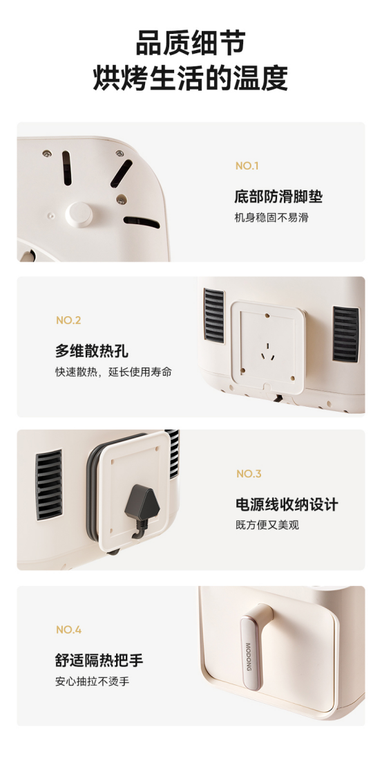 NO.1 底部防滑脚垫,机身稳固不易滑 NO.2 多维散热孔,快速散热,延长使用寿命 NO.3 电源线收纳设计,既方便又美观 NO.4 舒适隔热把手,安心抽拉不烫手