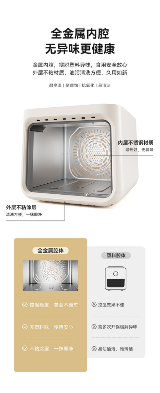 升级双层烤盘,容纳更多美味 全金属内腔,无异味更健康