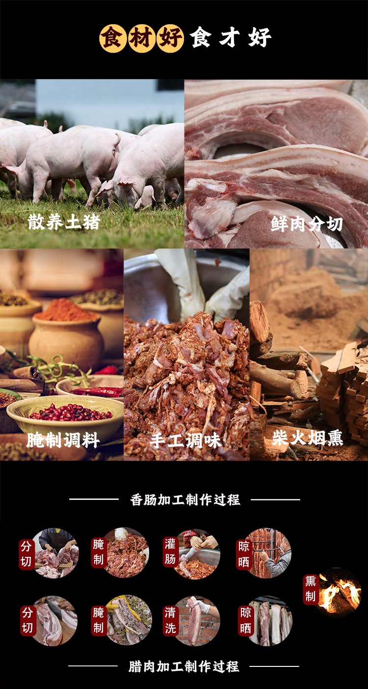 4)古法缓慢熏烤,自然增色,用时间酝酿出浓郁的芬芳,赋予香肠腊肉迷人的馨香,以及超越新鲜的悠远厚味。