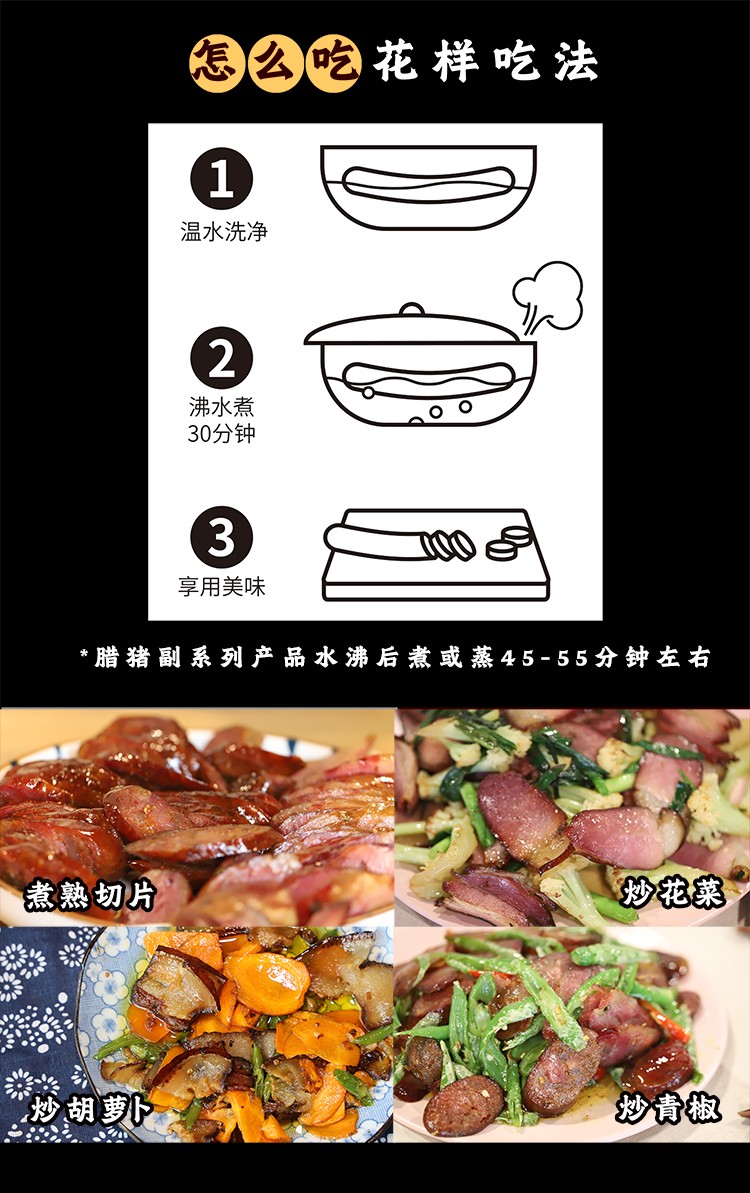 注意:腊猪副需煮45-55分钟;腊猪蹄仅适合炖汤食用。