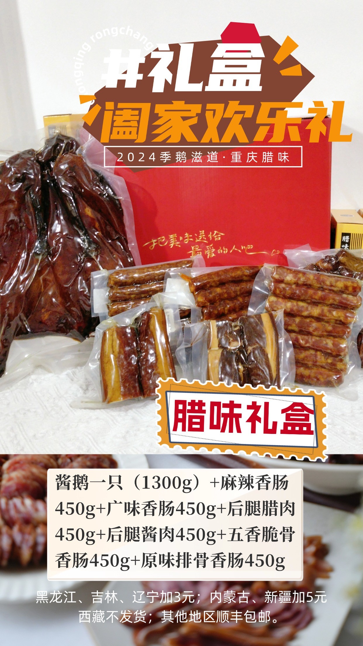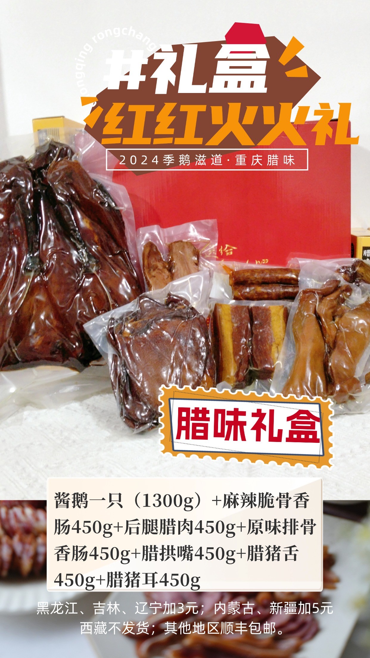 红红火火礼:酱鹅一只(1300g)+麻辣脆骨香肠450g+后腿腊肉450g+原味排骨香肠450g+腊拱嘴450g+腊猪舌450g+腊猪耳450g