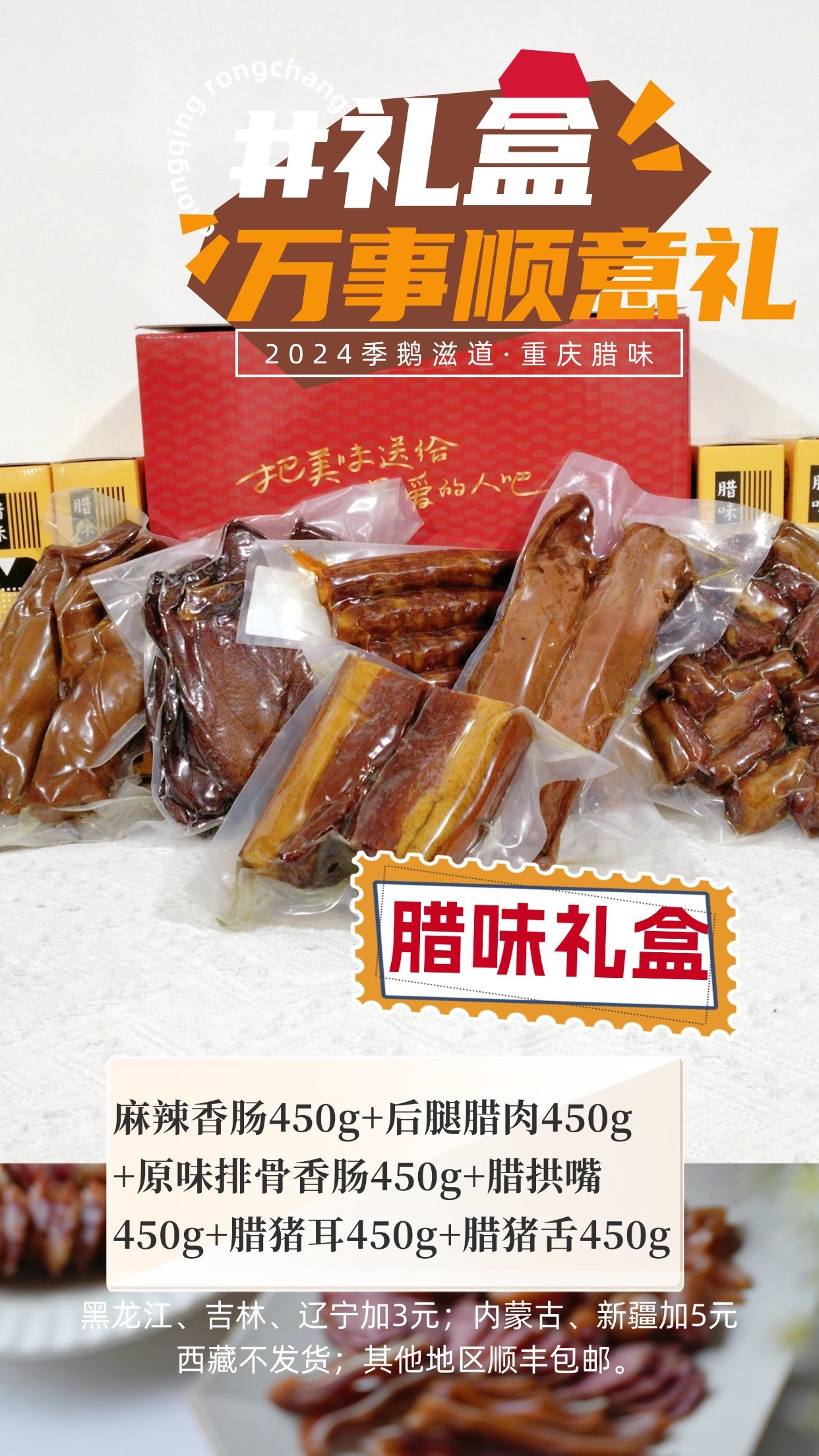 万事顺意礼:麻辣香肠450g+后腿腊肉450g+原味排骨香肠450g+腊拱嘴450g+腊猪耳450g+腊猪舌450g