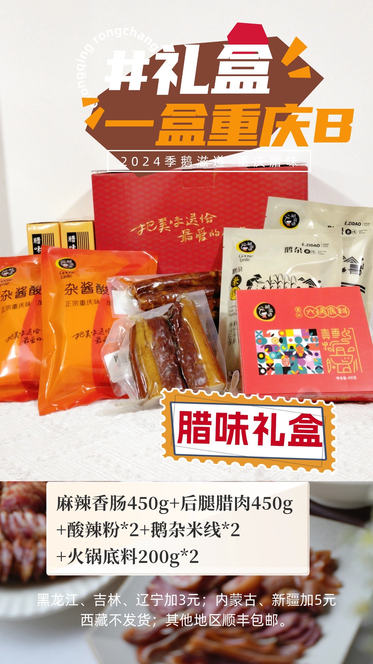 一盒重庆B款:麻辣香肠450g+后腿腊肉450g+酸辣粉*2+鹅杂米线*2+火锅底料200g*2