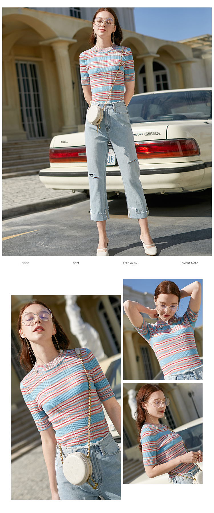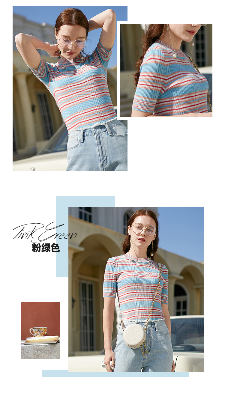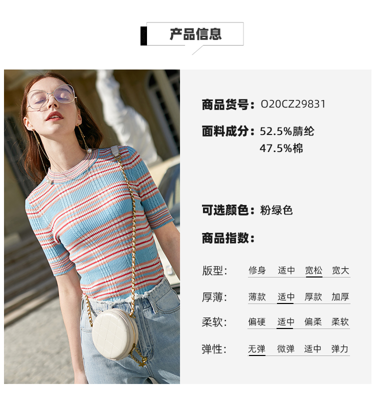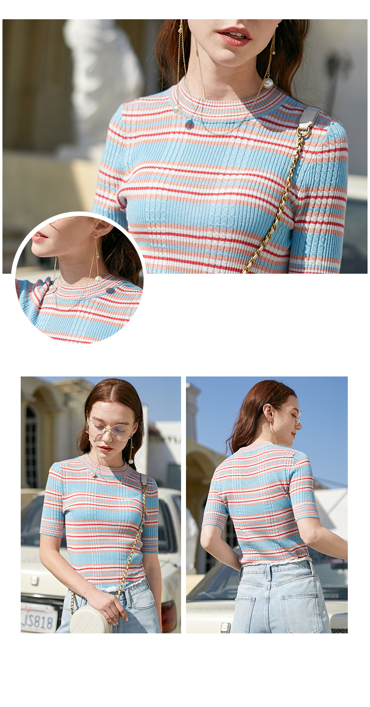 欧芮儿新款圆领短袖条纹毛针织衫女内搭打底上衣薄款