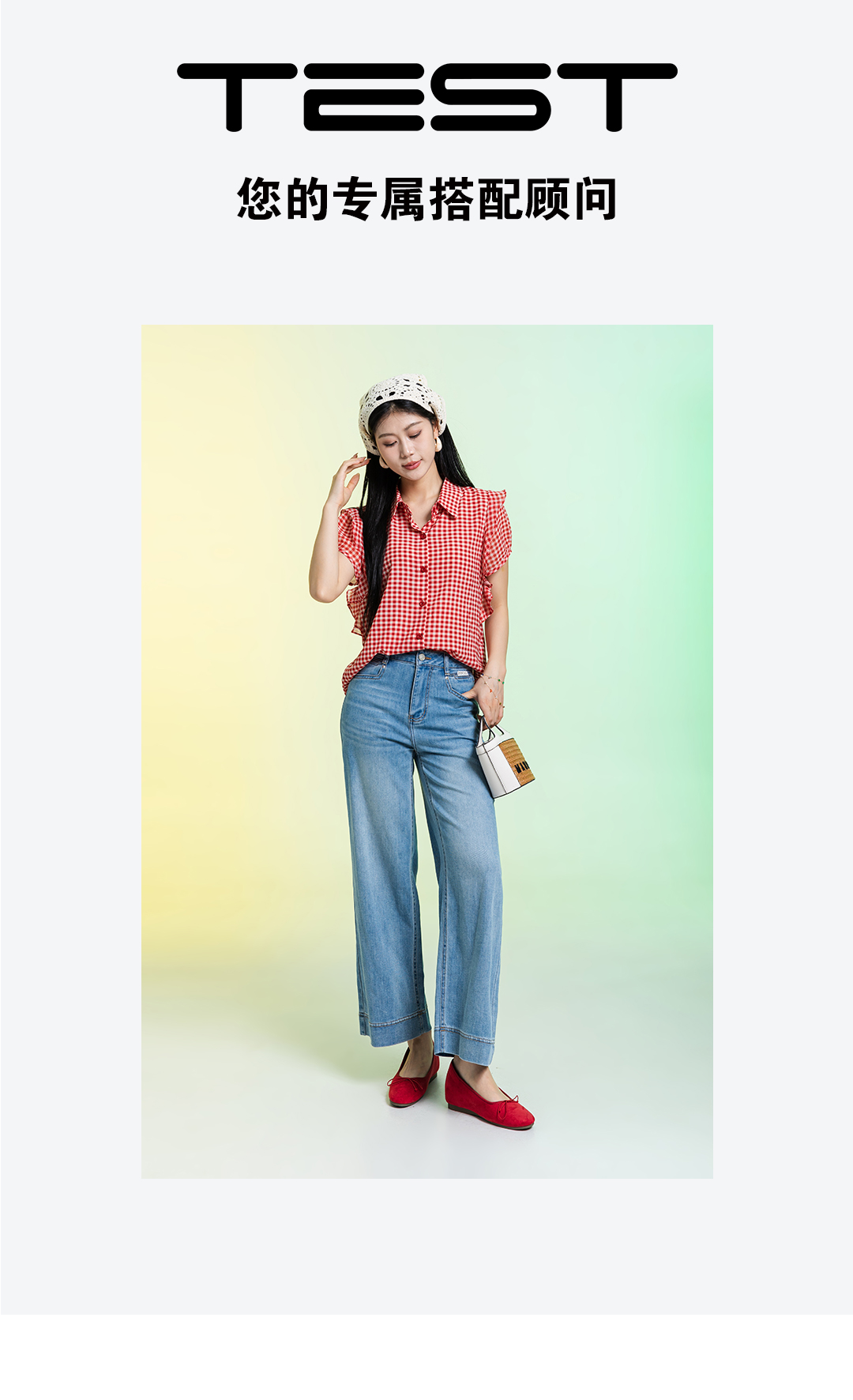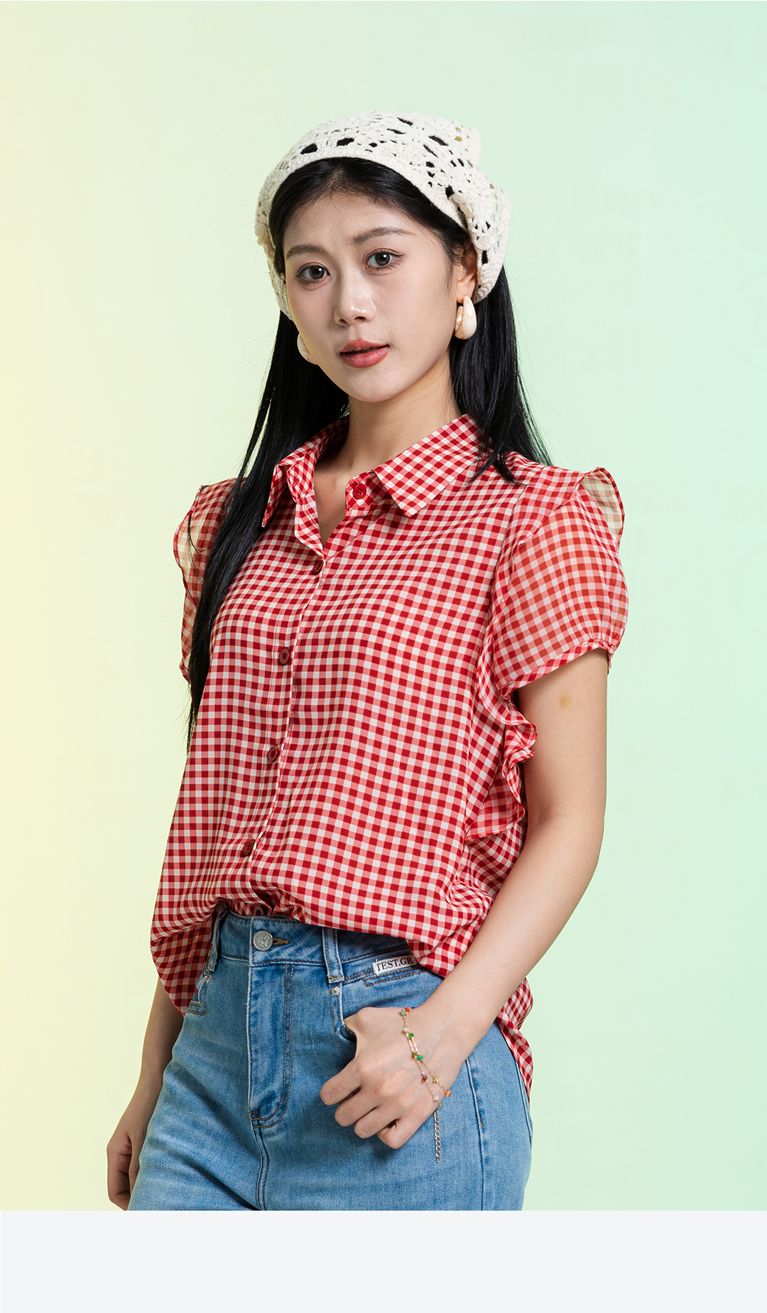 夏上新法式甜美减龄宽松红白格子荷叶边短袖衬衫1262092
