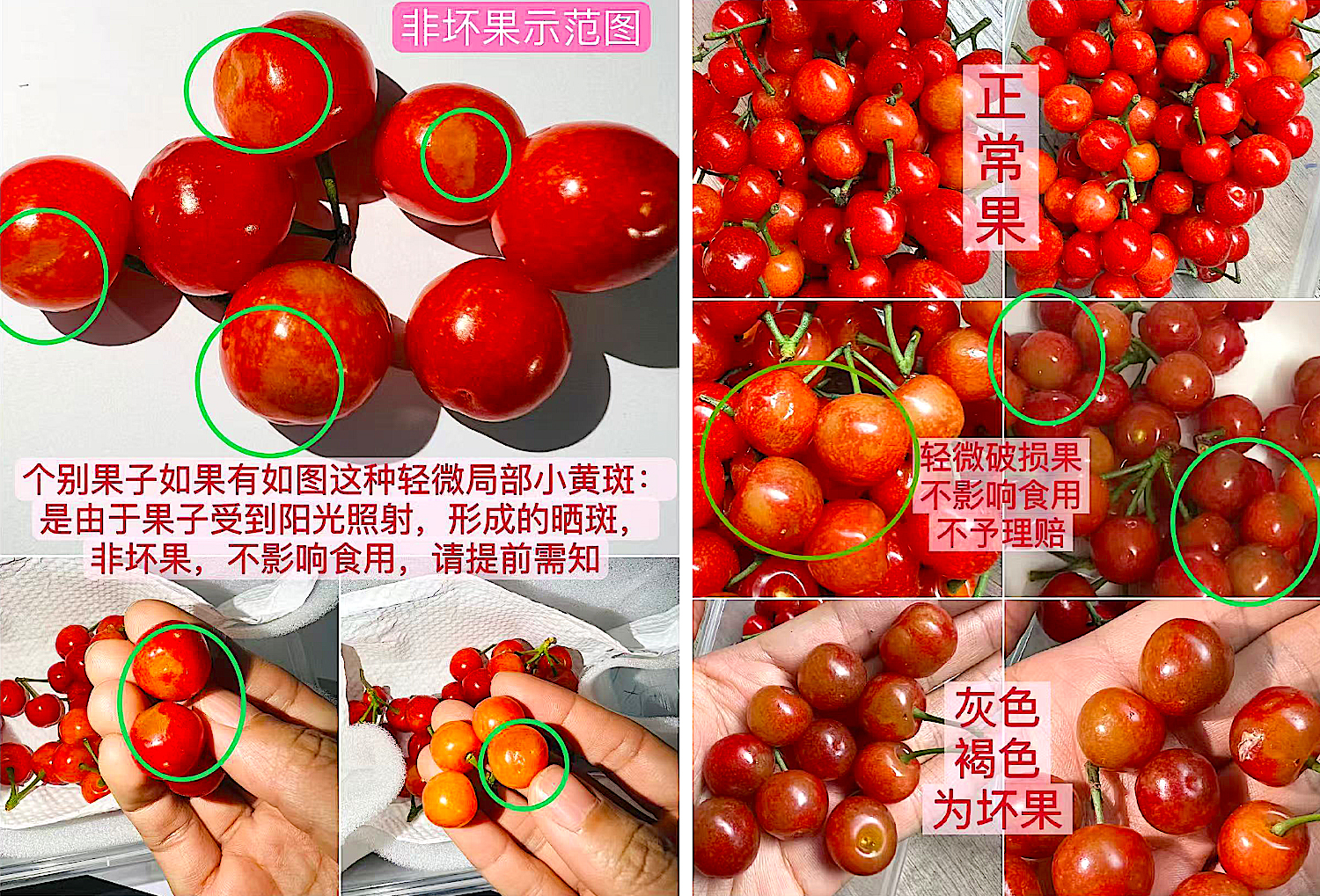 4.小樱桃肉质娇嫩,经过运输途中的颠簸,到货后,可能有轻微磕碰挤压痕迹和皱损,不影响食用,不在售后范围内。
