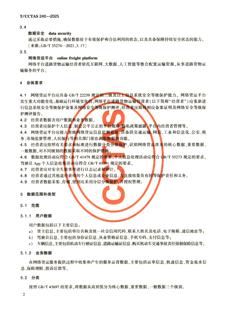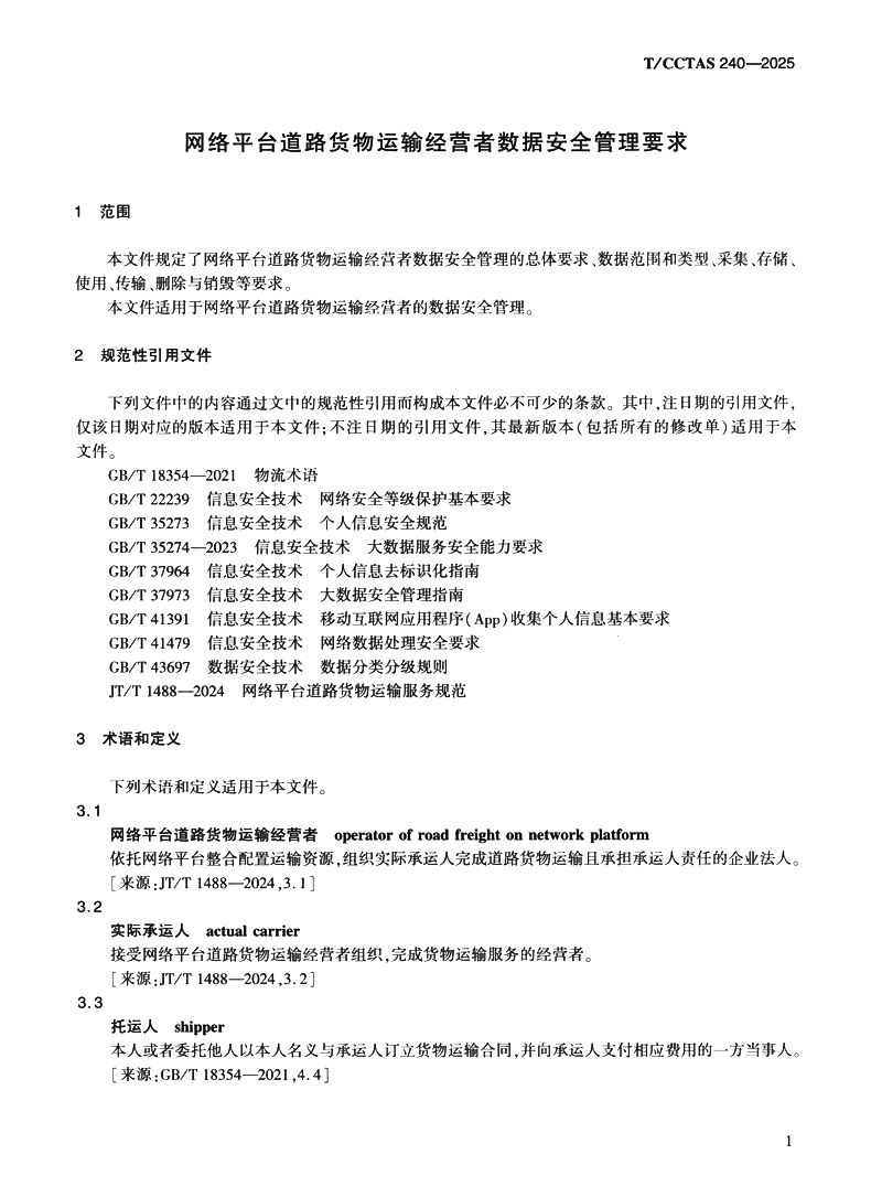 书名:网络平台道路货物运输经营者数据安全管理要求T/CCTAS 240—2025