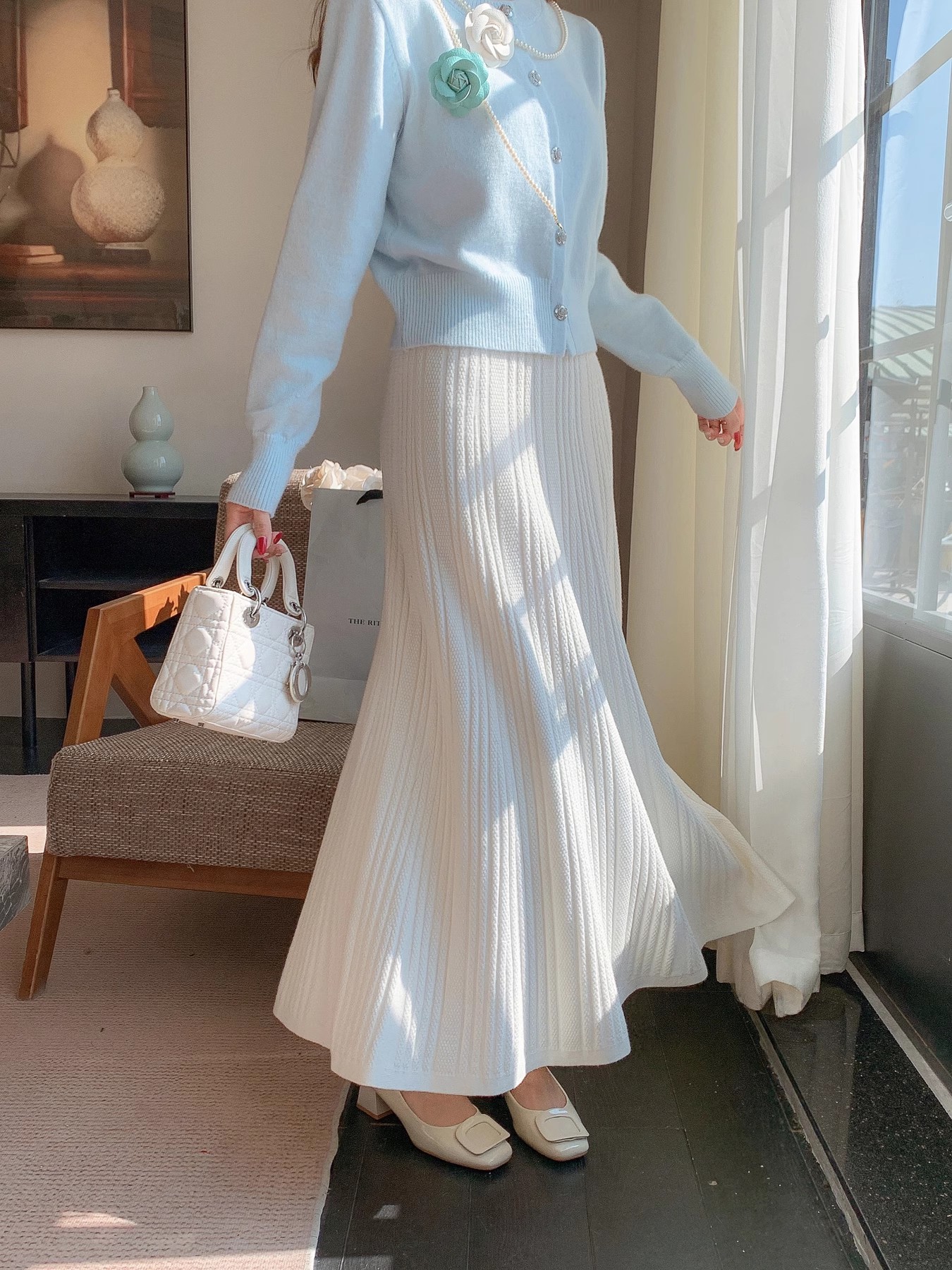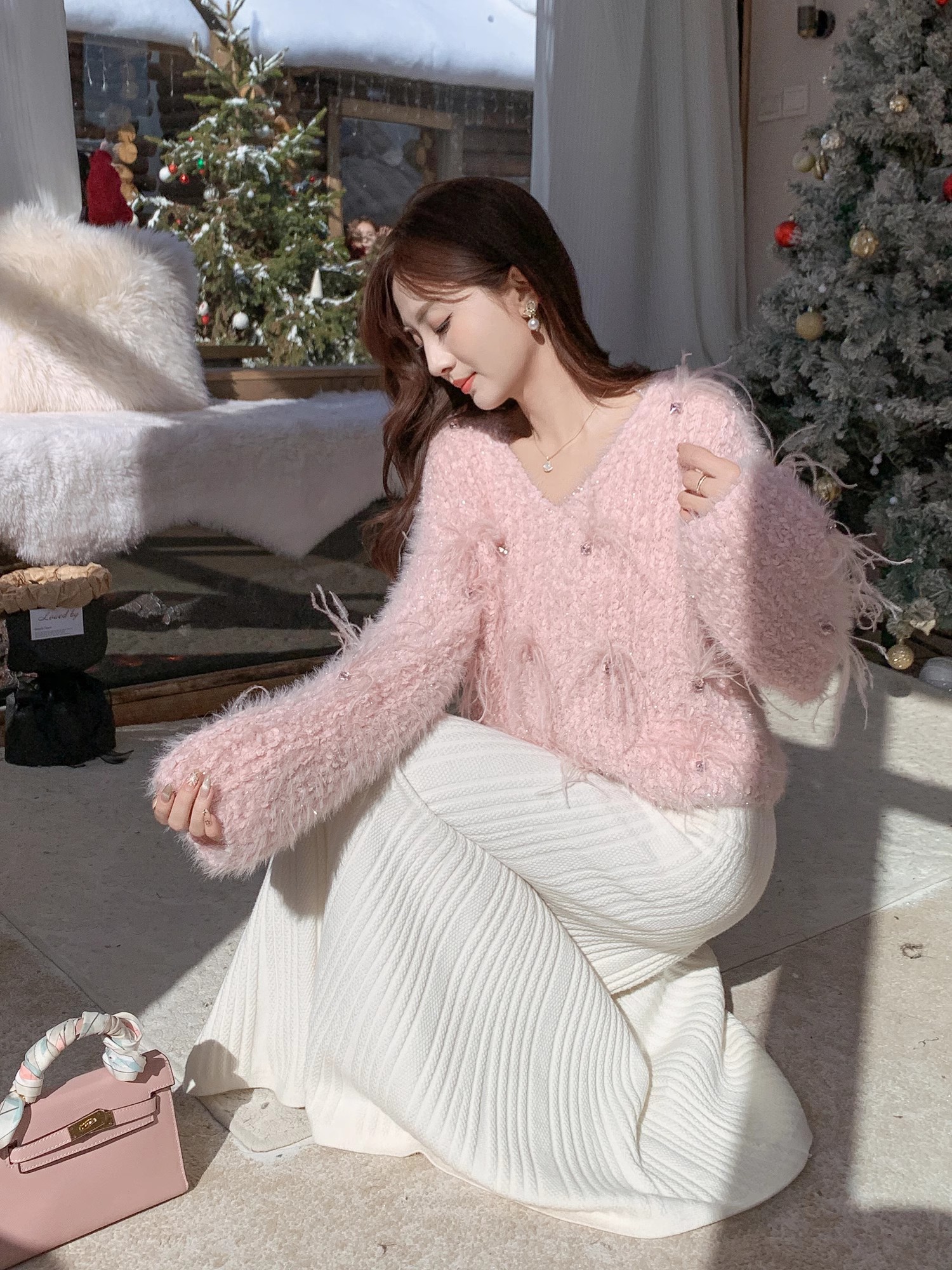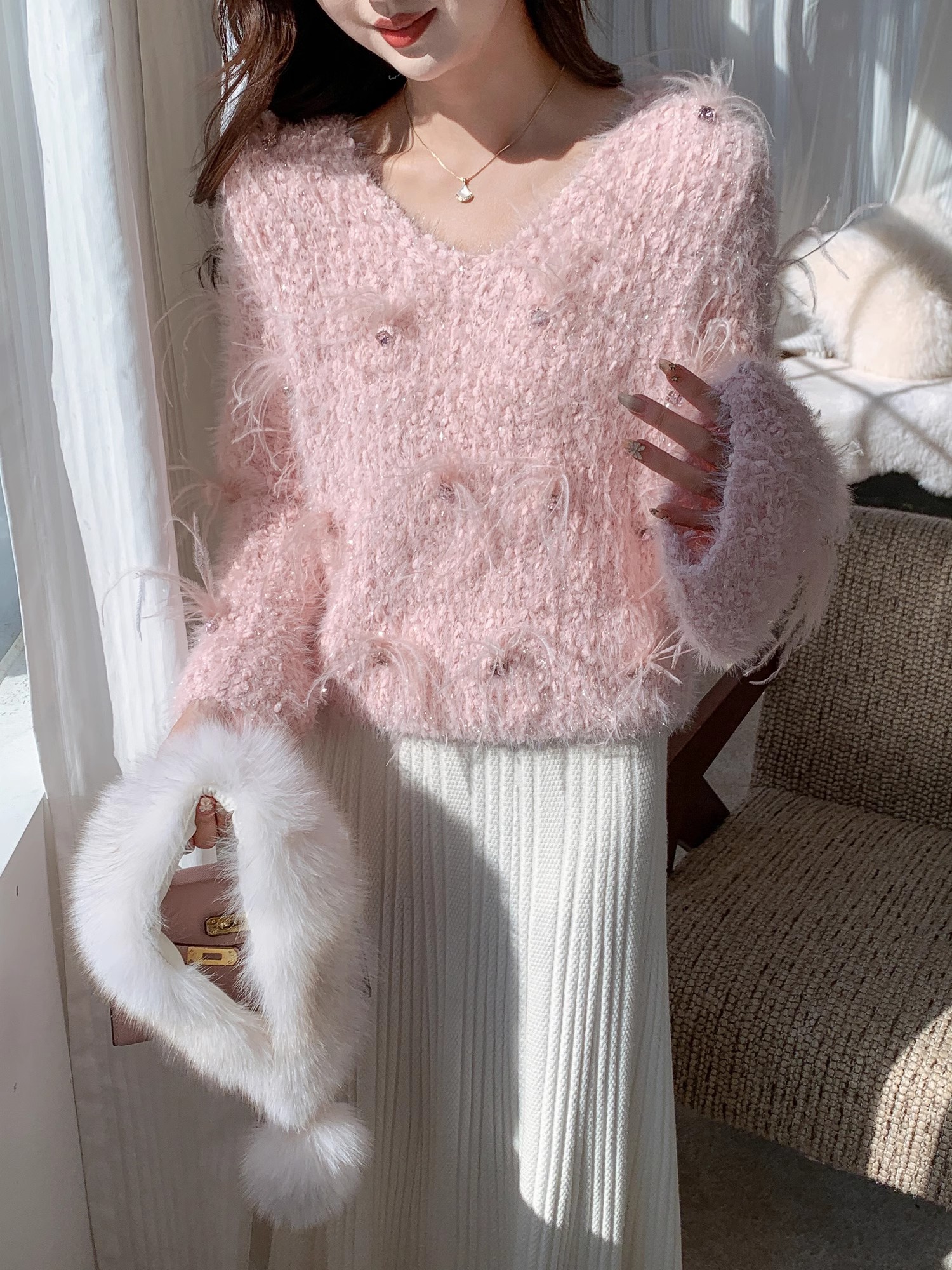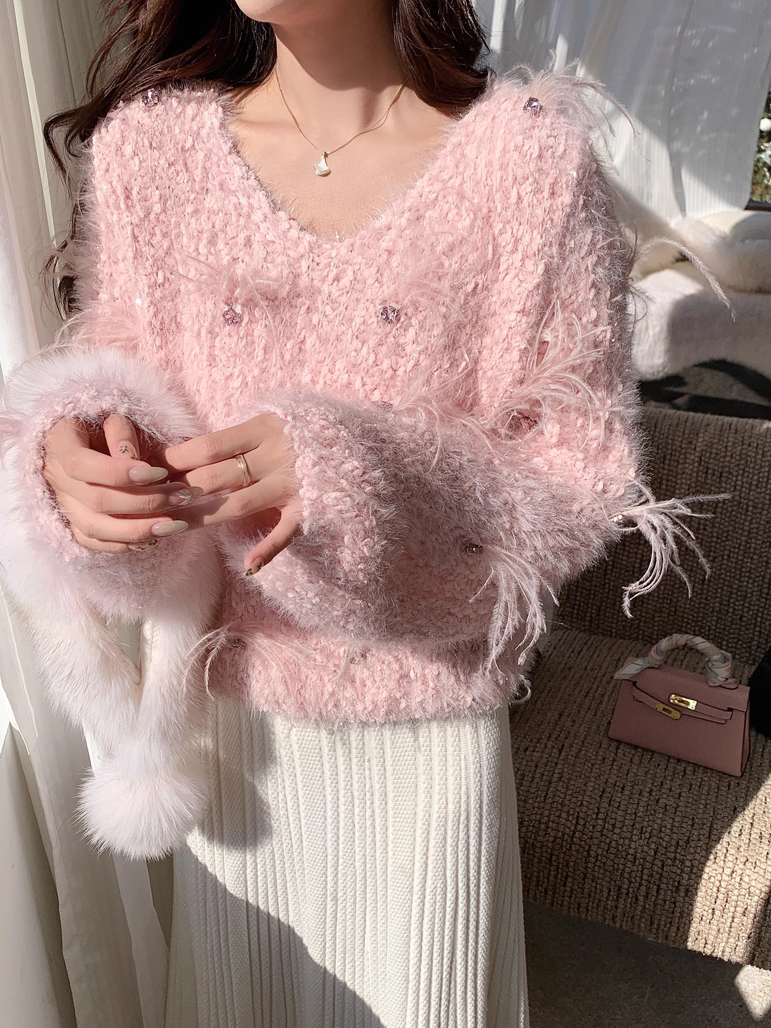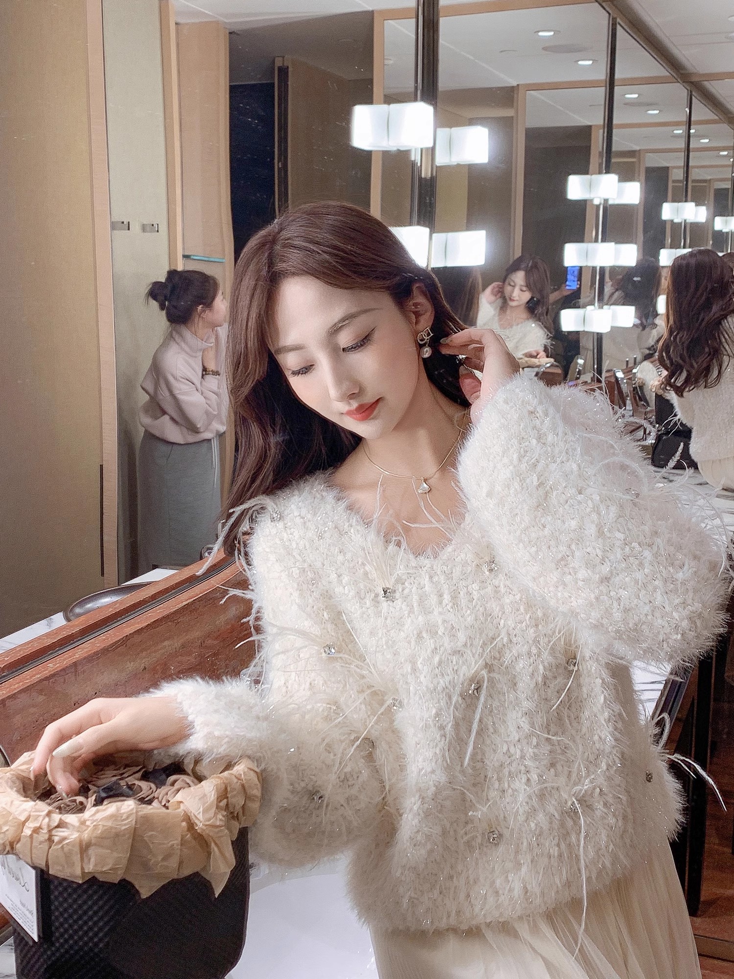张心子【樱花白茶】仙女慵懒风宽松弹力手工羽毛毛衣 U2411095