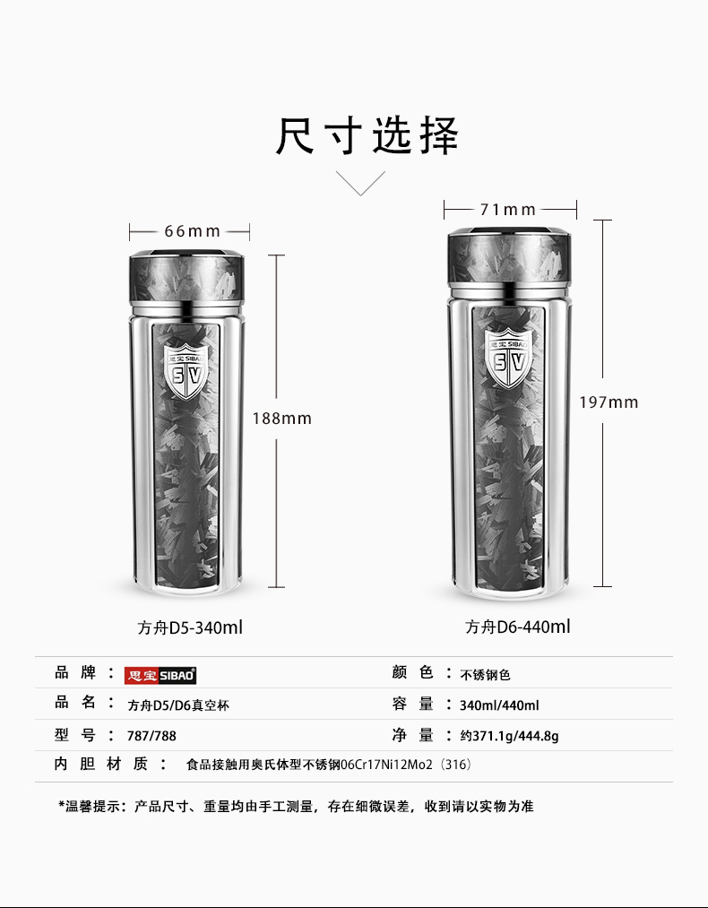 思宝新品方舟D5/D6真空保温杯便携车载茶杯礼盒包装胖东来同款