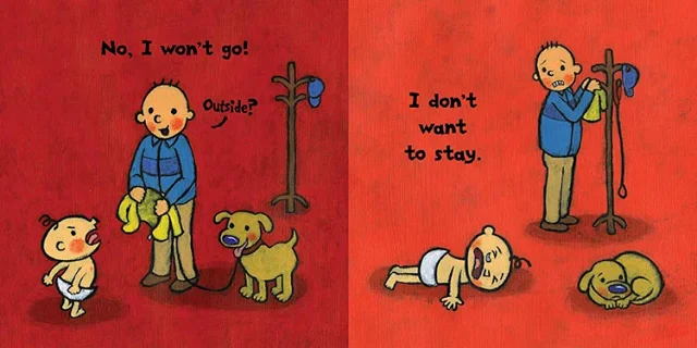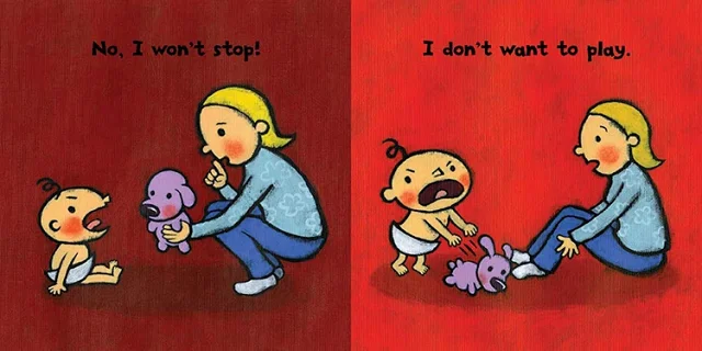1-3岁,特别是1.5-2.5岁之间的孩子,特别会有许多相反的举动出现,你愈是要他怎么做他愈是不想这么做,我们声称这是宝宝的一个叛逆期。Leslie Patricelli的系列幼儿书,皆以对照的方式,让孩子发现原来有些动作是不可以的,更让爸妈觉得很有趣的会心一笑,因为这都是家里宝贝容易产生的行为模式呀!