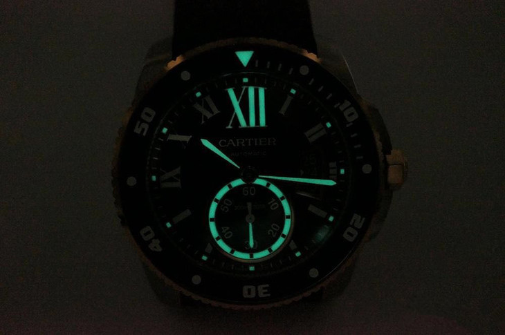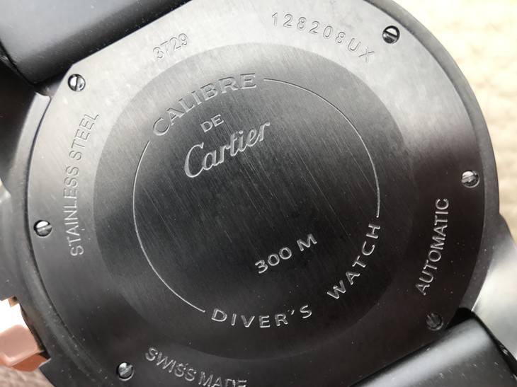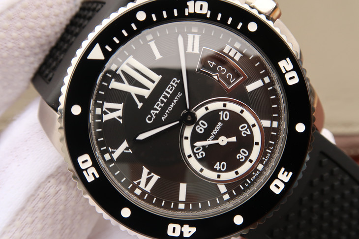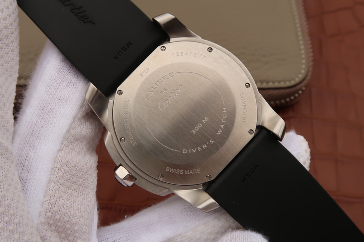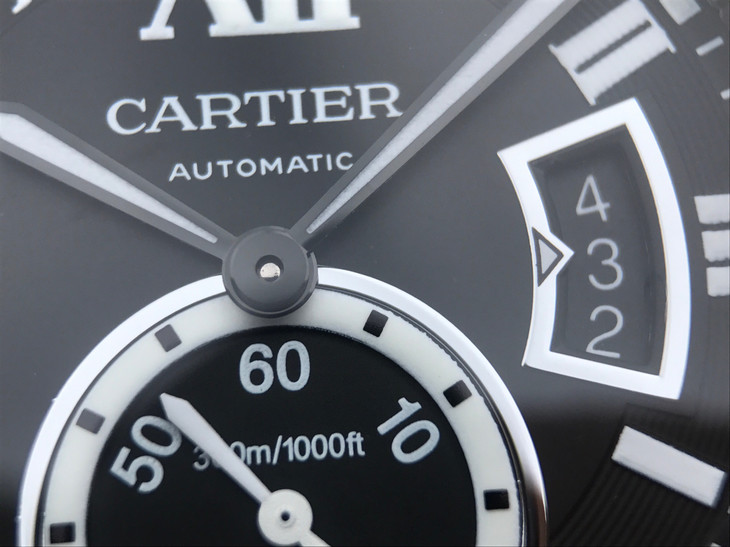卡地亚CALIBRE DE CARTIER卡历博系列W7100056潜水腕表,42mm直径,1904一PS MC自动机械机芯,300米防水。蓝宝石镜面。详细评测:1 , 壳身厚度,圈口结构与装配,圈口字体形状,大小,填油工艺,与原装一致,壳身三时位护桥(散件)组装紧密程度高,犹如一体成型,壳身的各种拉砂打磨,拉砂的粗细程度,与原装高度一致!壳身耳边的光边线非常幼细,为全手工打磨,幼细的光边线打磨得粗幼均匀又光亮,大小适中,实难不易!从这也充分体现出卡地亚的线条设计出色之处!2 ,把头上采用与原装进口一样的合成尖晶兰宝石,切割与色泽效果一致,3 ,字面经过16道印刷工序,字体印刷立体,字面夜光采用瑞士 夜光涂层,散发出超强夜光,4 : 针与原装一样,采用立体效果针,与现有市面上的版本不同,整体效果差异明显,5 :底盖字体做工与原装一致,字体采用腐蚀,雕刻两种工艺!6 : 固机内罩,原装的固机内罩表面是采用滑砂处理方式,复刻之版本在这个方面也是跟足原版,这可以说也是 的首次!