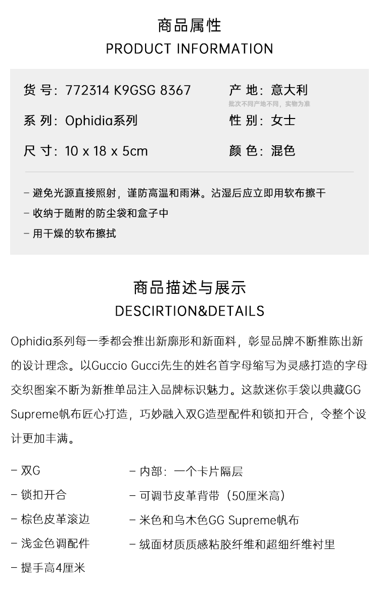 GUCCI 古驰 女士Ophidia系列迷你手提包 混色 772314 K9GSG 8367