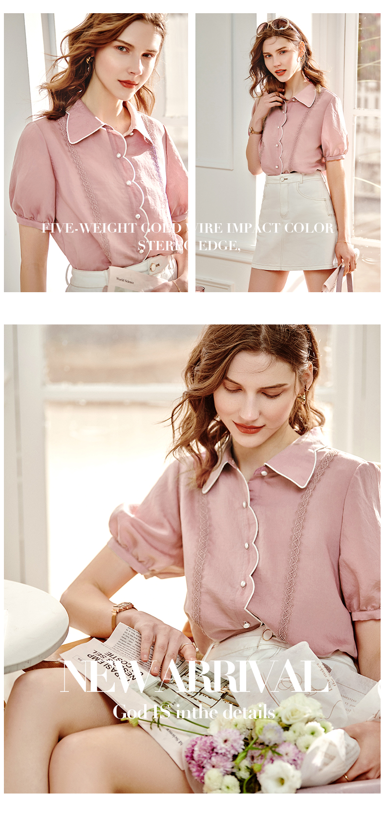 欧芮儿2026春新款设计感扭结领T恤女法式钩花袖口修身上衣长袖