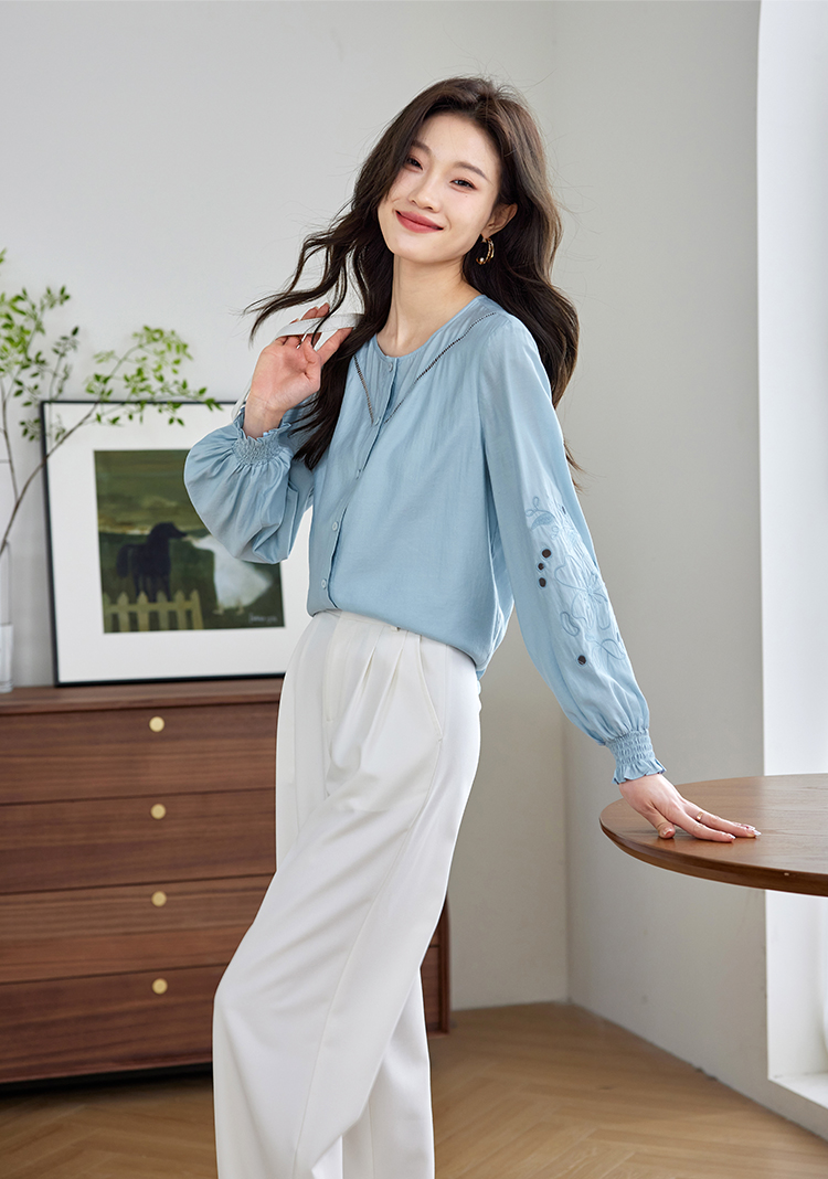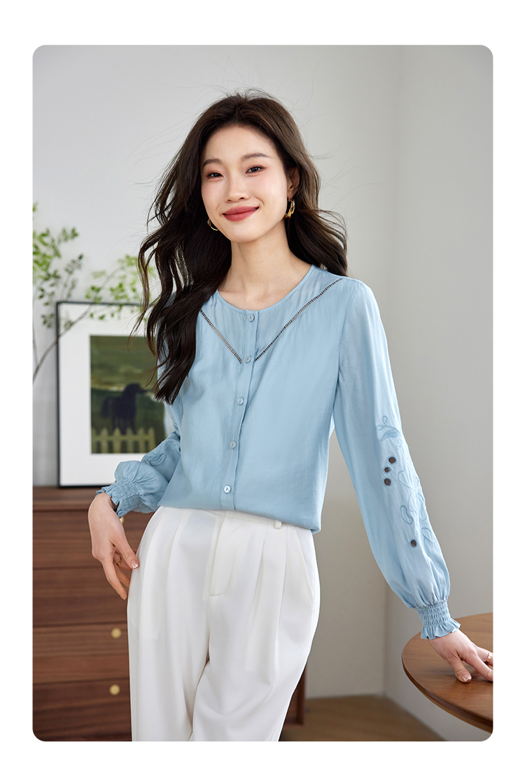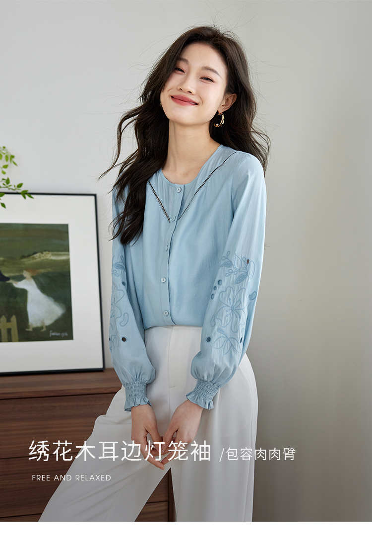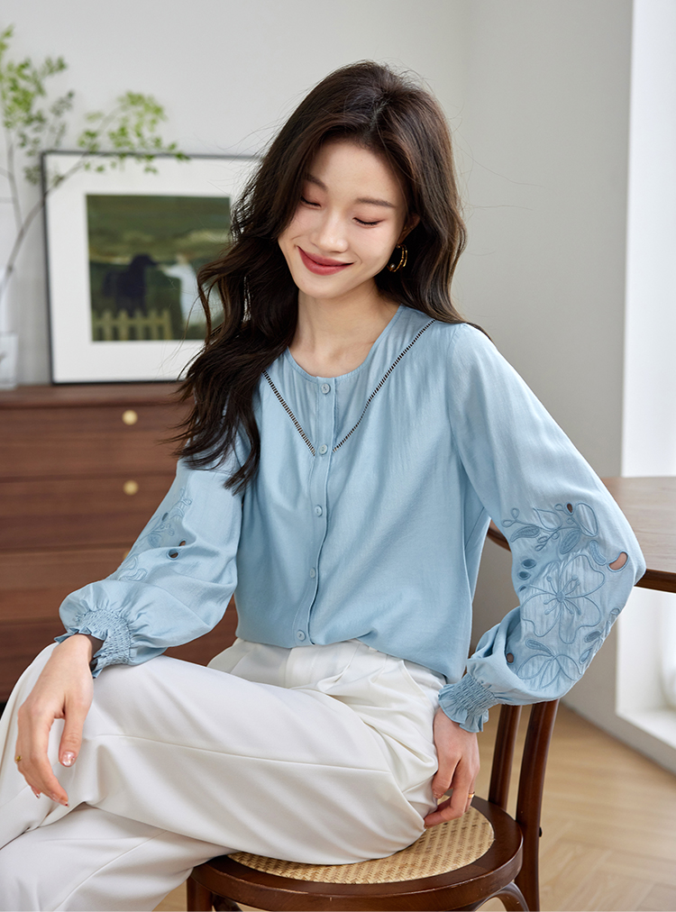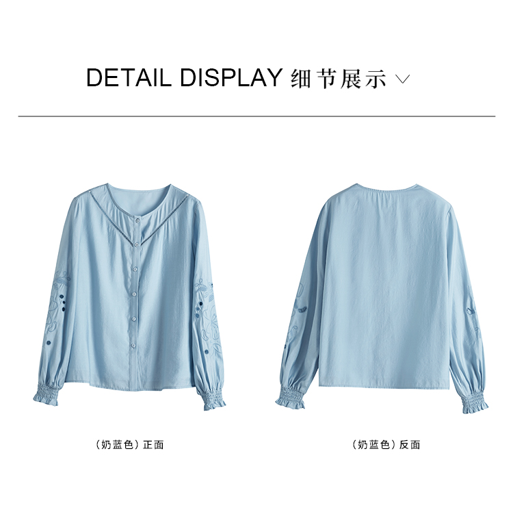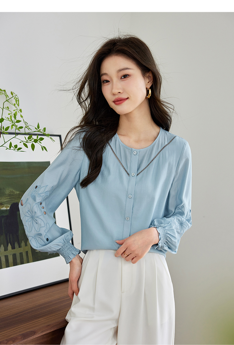 【年终特卖】熙世界2025秋季新款法式刺绣泡泡袖衬衣设计感气质显瘦衬衫上衣