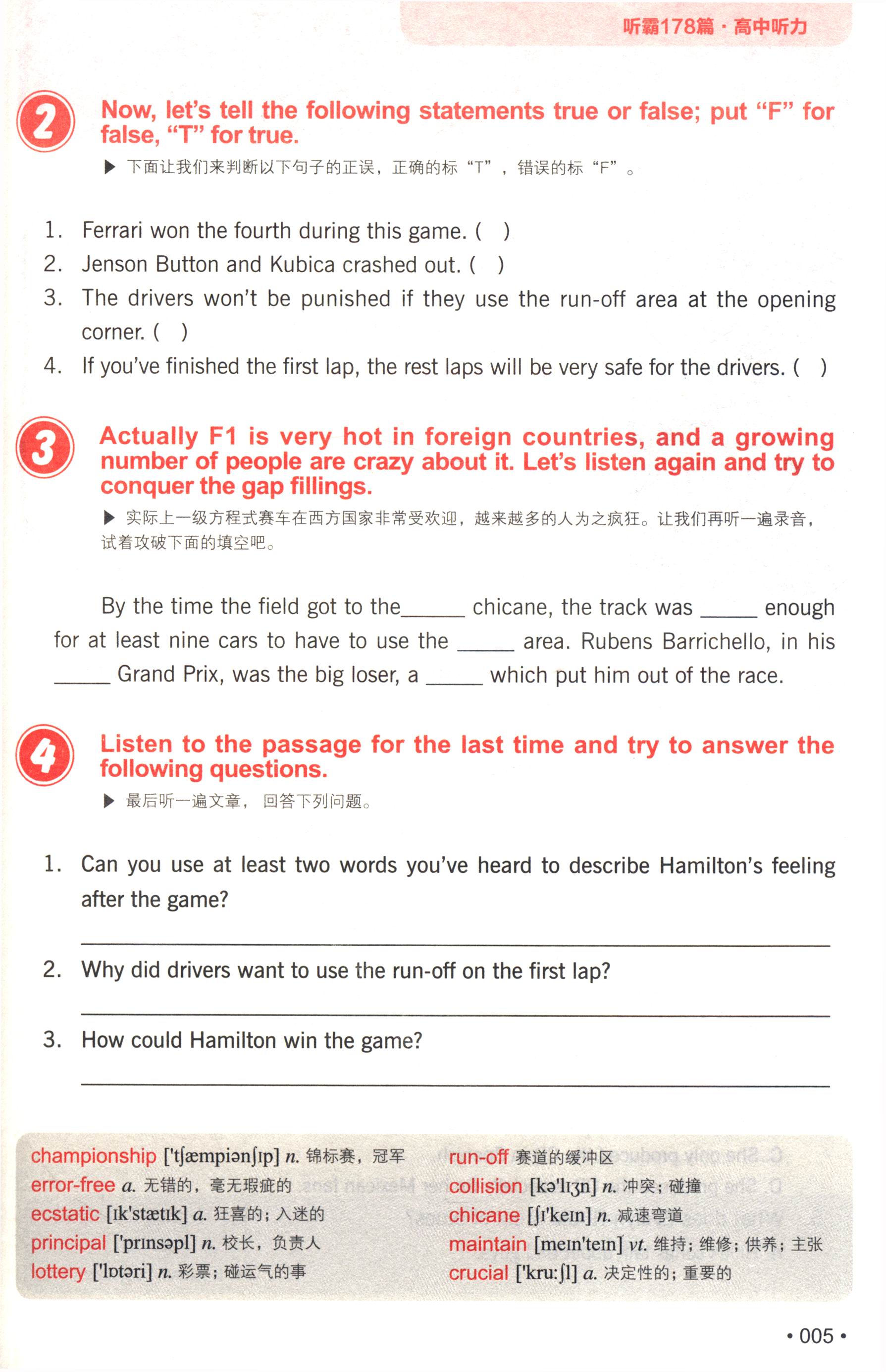 《听霸178篇:高中英语听力强化升级训练》将178篇听力练习分八个主题:时尚人物、社会文化、环境与健康、家庭与教育、潮流前线、时事见闻、品味人生、生活百态,内容丰富,难度中等偏上,时代感强。每篇文章对生词提供释义和音标,并设有选择、判断、填空、汇总填表等丰富听力理解练习。《听霸178篇:高中英语听力强化升级训练》最后还附送听力文章原文、全文翻译和练习参考答案,从听、练、译、读等方面帮助读者提升英语听力能力,理解语言点,扩大知识面。