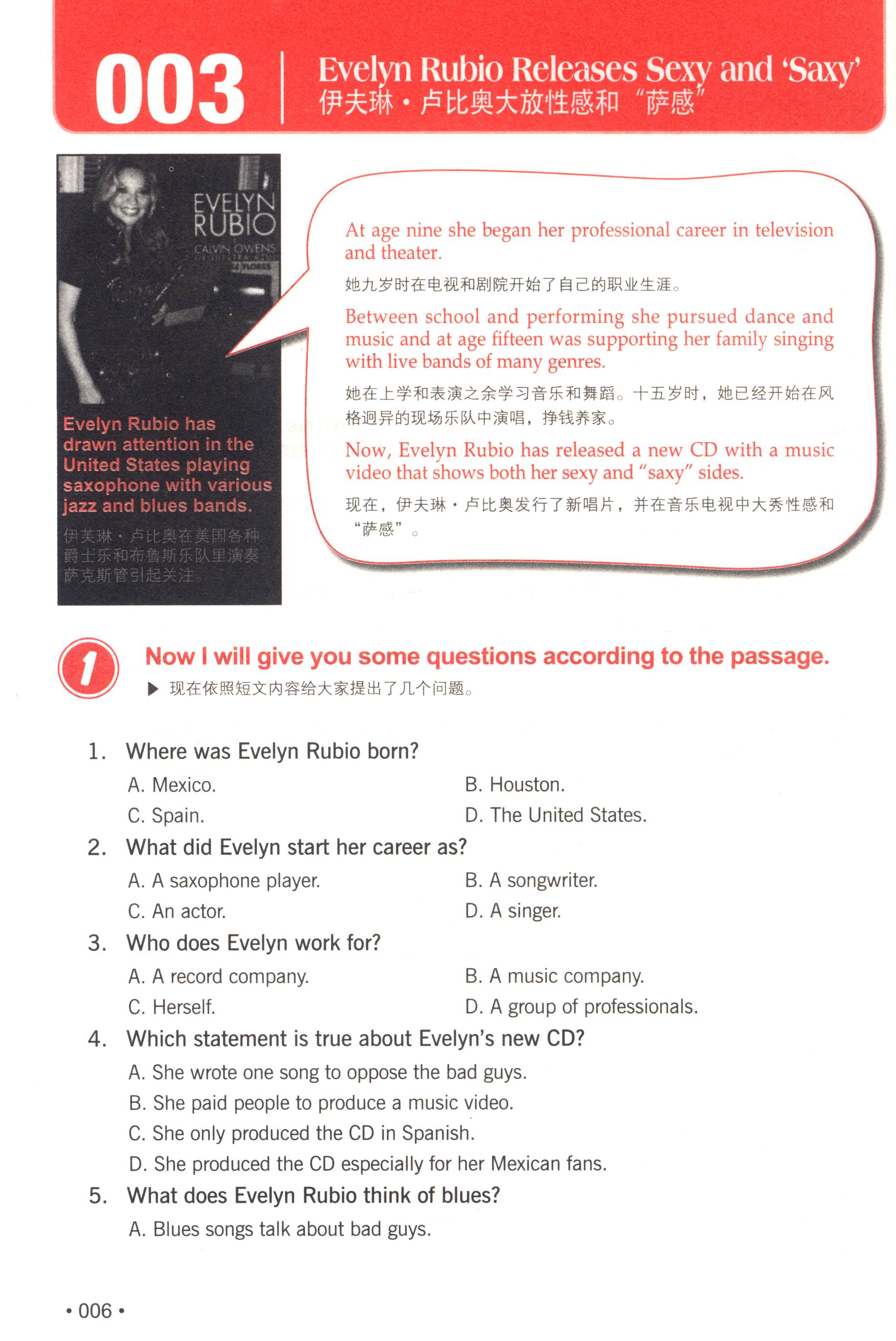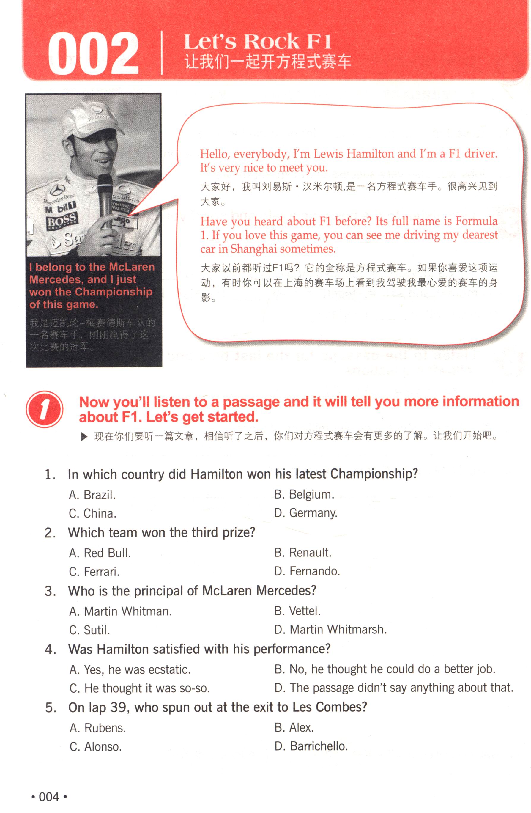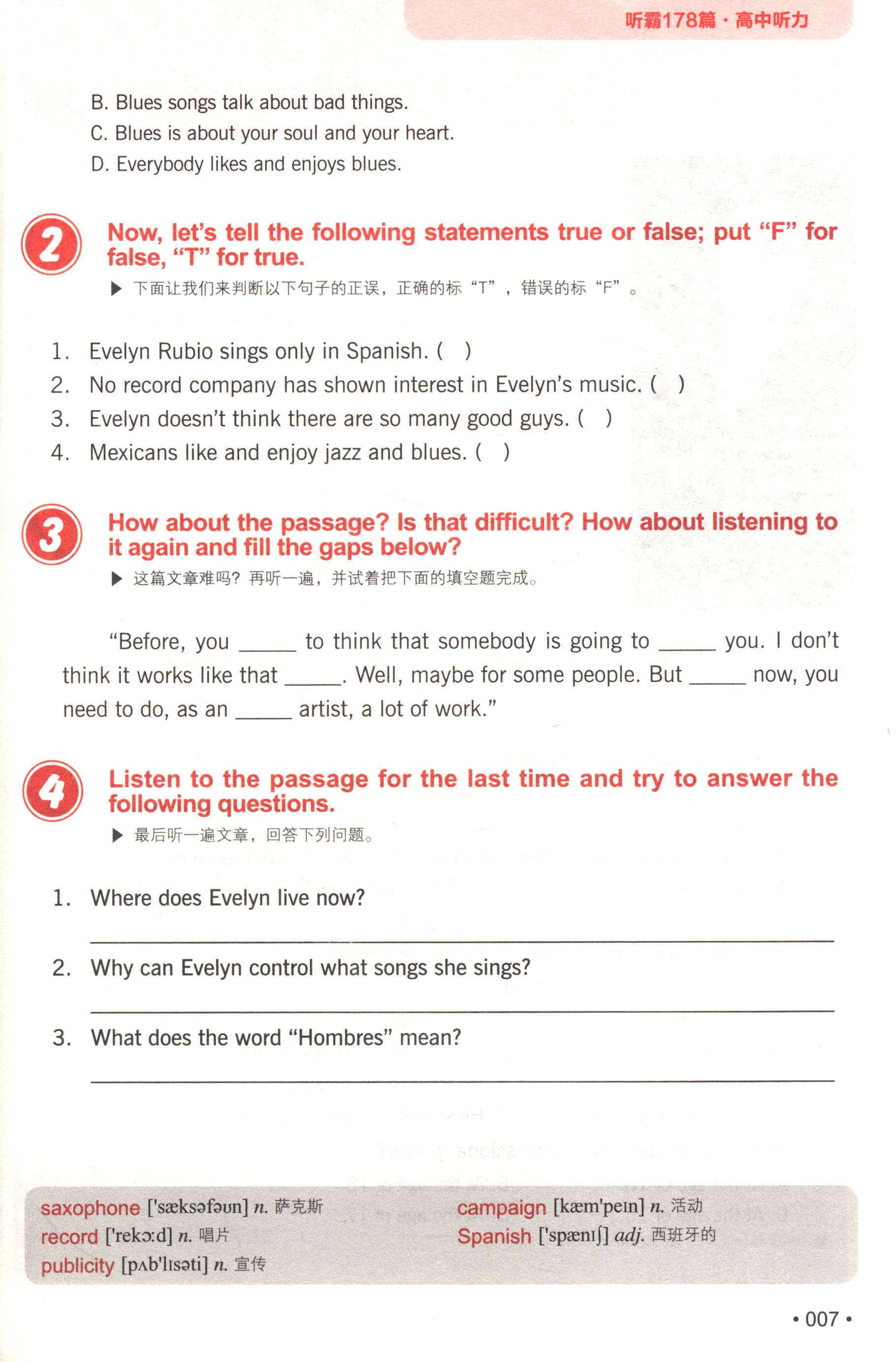 读图部分:通过图片可以使学生大概了解文章内容。词汇部分:摘自文章中的单词可以让学生轻松理解文章内容,同时扩大学生词汇量。练习部分:通过判断正误、单项选择、回答问题等多种形式的练习使学生进一步理解听力内容。