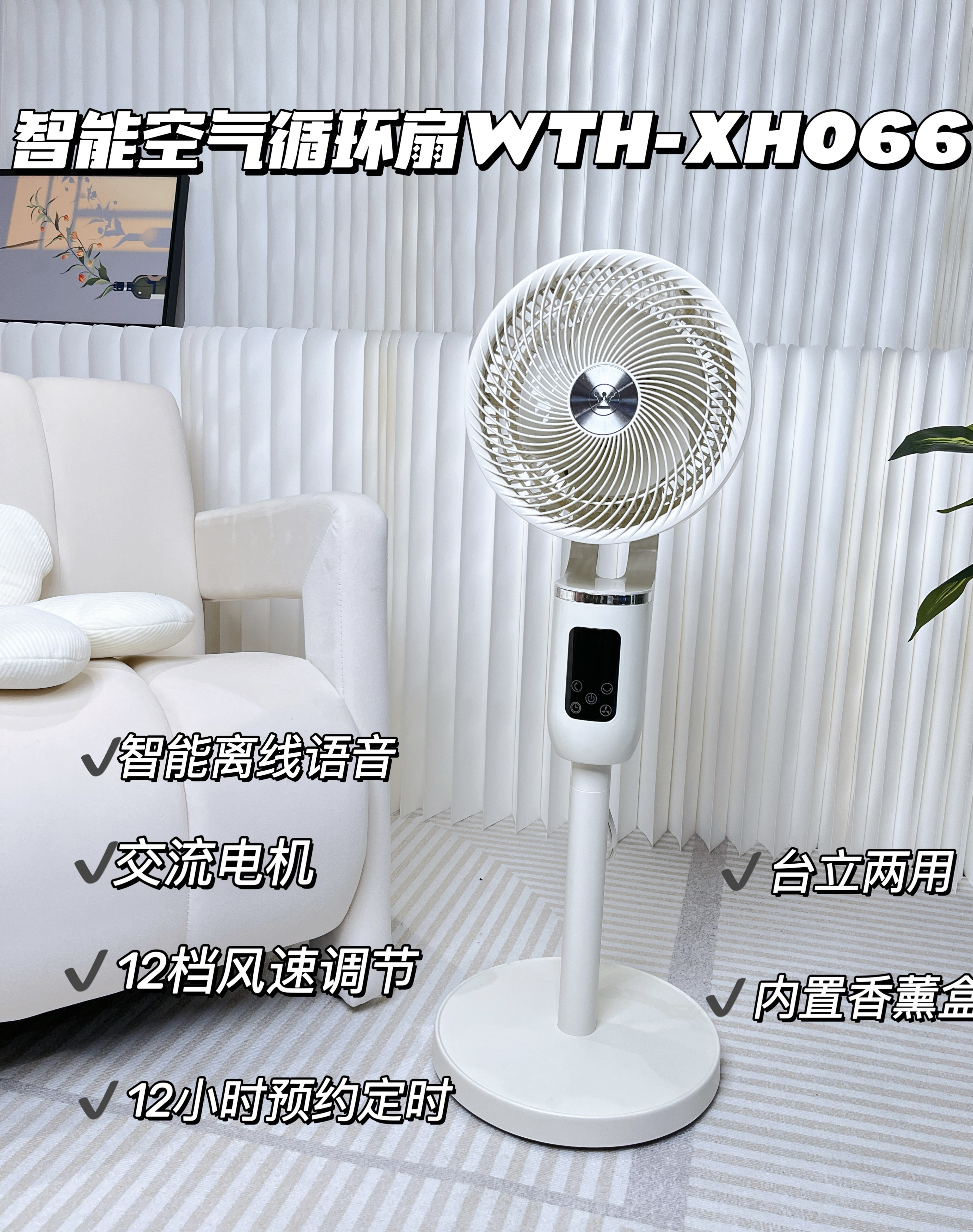 【智能款WTH-XH066】智能语音、液晶显示、小程序蓝牙操控、3D摇头送风、12档风速调节、12小时定时、台立两用、内置香薰盒