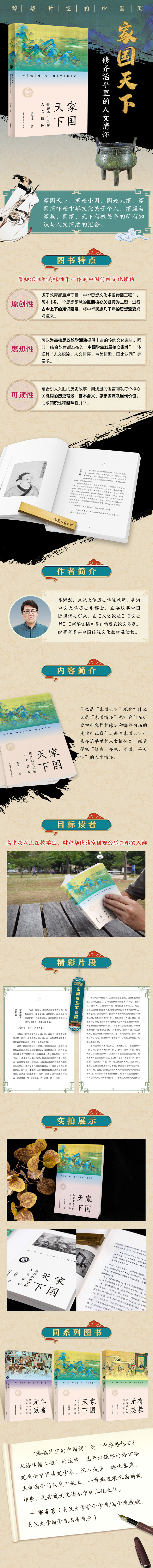 什么是“家国天下”观念?什么又是“家国情怀”呢?它们在历史中有怎样的缘起和哪些内涵的变化?让我们带着这些问题,走进古人的精神世界,感受儒家念兹在兹、不断追求的“修身、齐家、治国、平天下”的人文情怀。《家国天下:修齐治平里的人文情怀》循着由个人的修身、家的情感、爱国之心到天下大同的思路,选取“修齐治平”“饮水思源”“尽忠报国”“天下为公”等诸多沿用数千年的中国文化关键词,深入浅出、层层递进地展现中国人“家国天下”的观念。这些跨越时空的中国词,我们大多耳熟能详,也有一些并非人人尽知,希望它们最终都能殊途同归、百川汇海,融入我们对家国文化的理解之中。