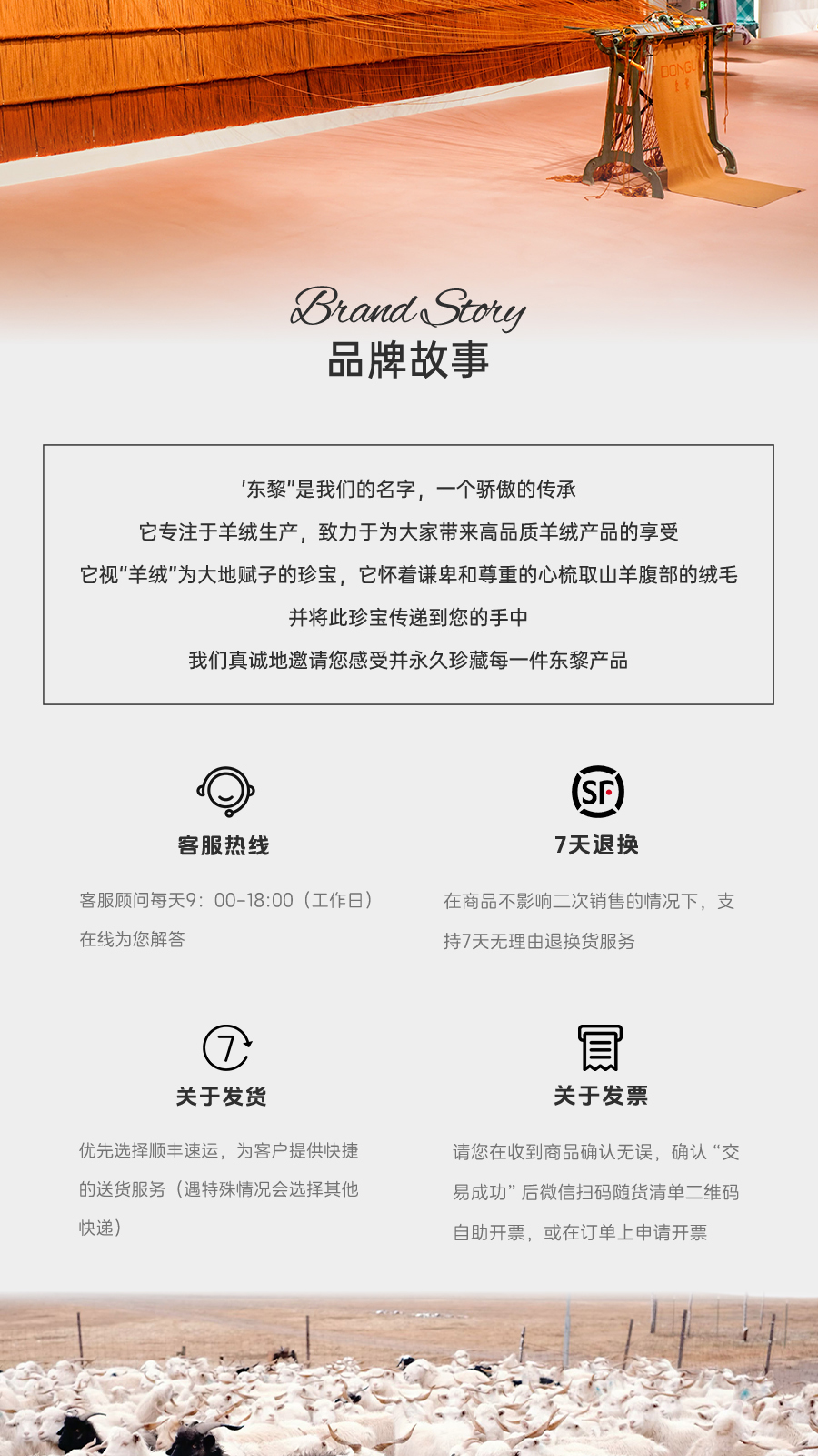 东黎羊绒是赤峰东荣集团自主品牌,自有牧场/羊绒制品全产业链优势,实现了羊绒从“牧场”到“商场”的华丽转变。