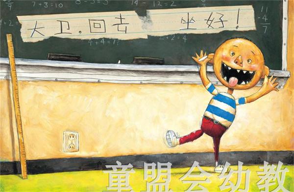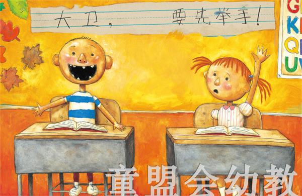 《大卫上学去》一书主要描述了大卫在学校学习规矩的状况。与《大卫,不可以》*的不同是,在前一本书里,大卫唯我独尊、一个人胡闹;而在后一本书里,大卫的身边有了其他的小朋友,他必须得学会与别人相处,并且尊重学校里的规矩。