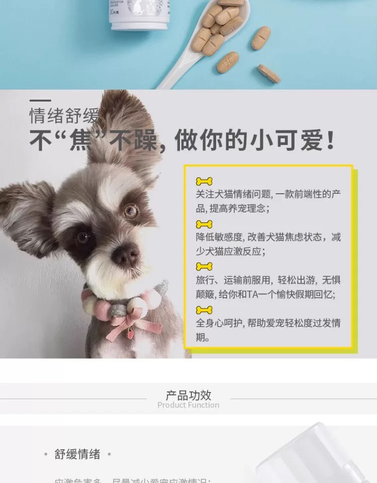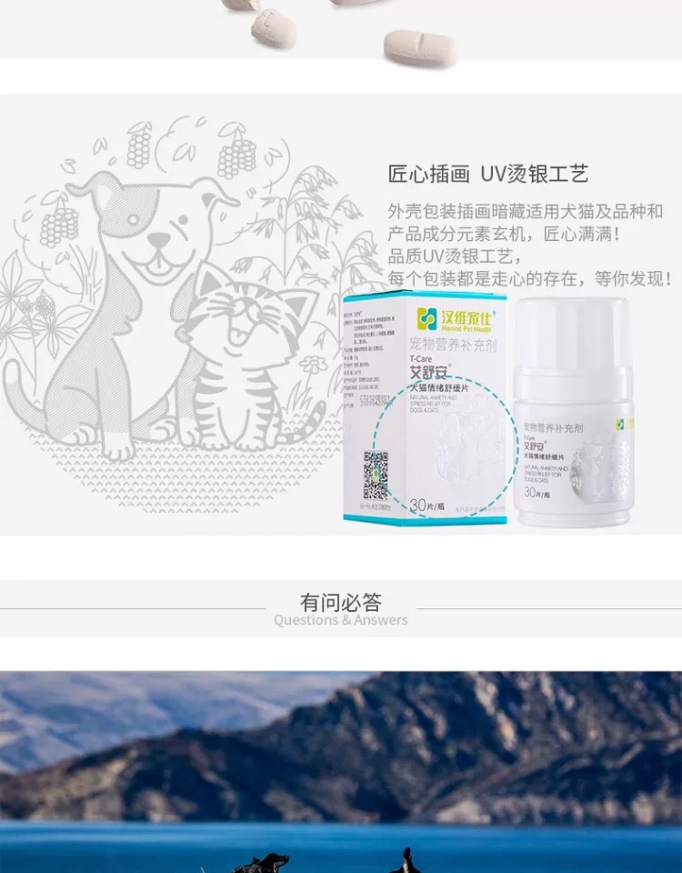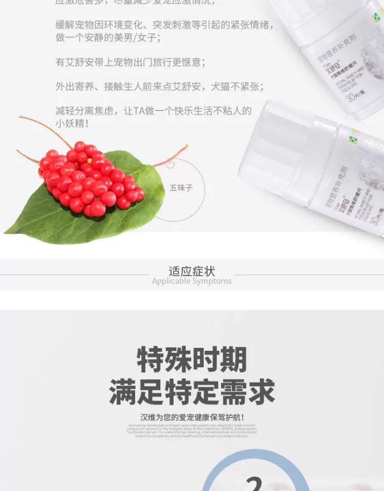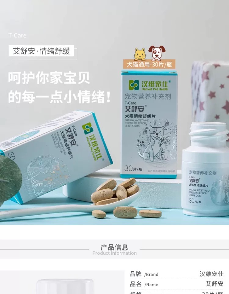 汉维 艾舒安 犬猫情绪舒缓片 减轻焦虑 对抗应激 舒缓情绪 30片/瓶 医院直供
