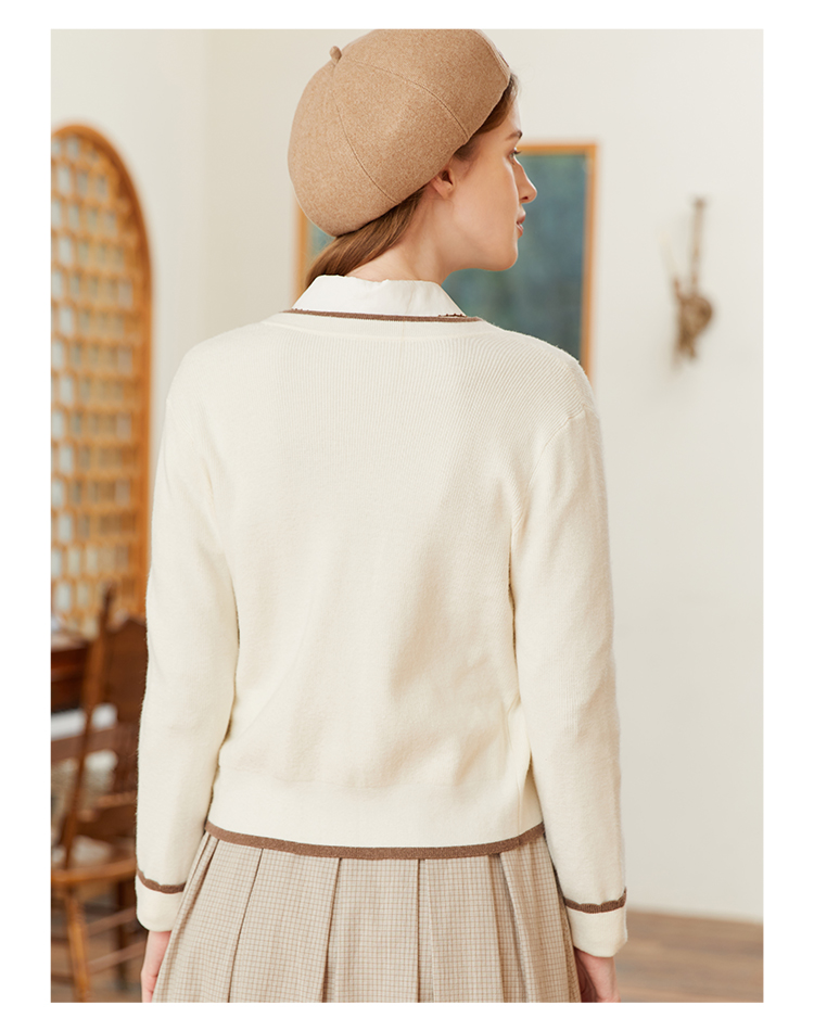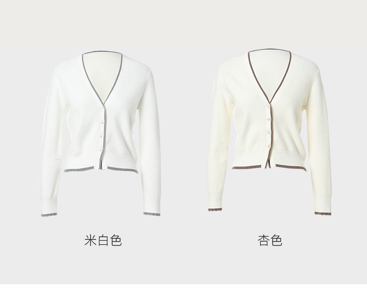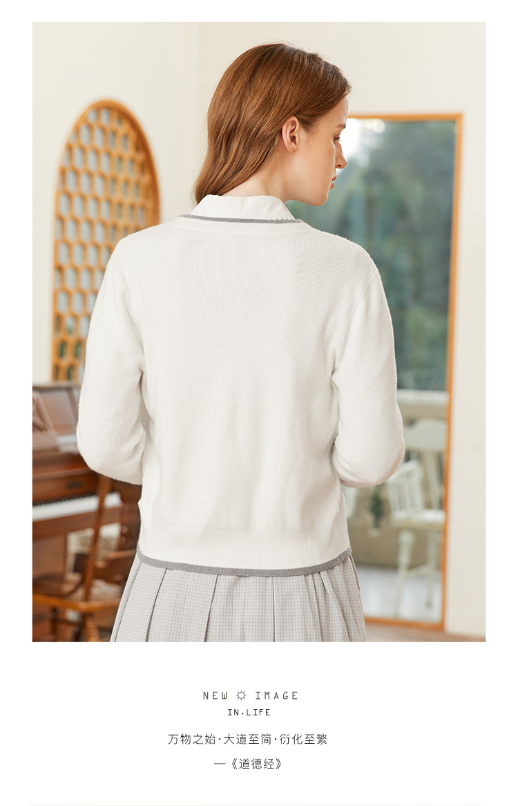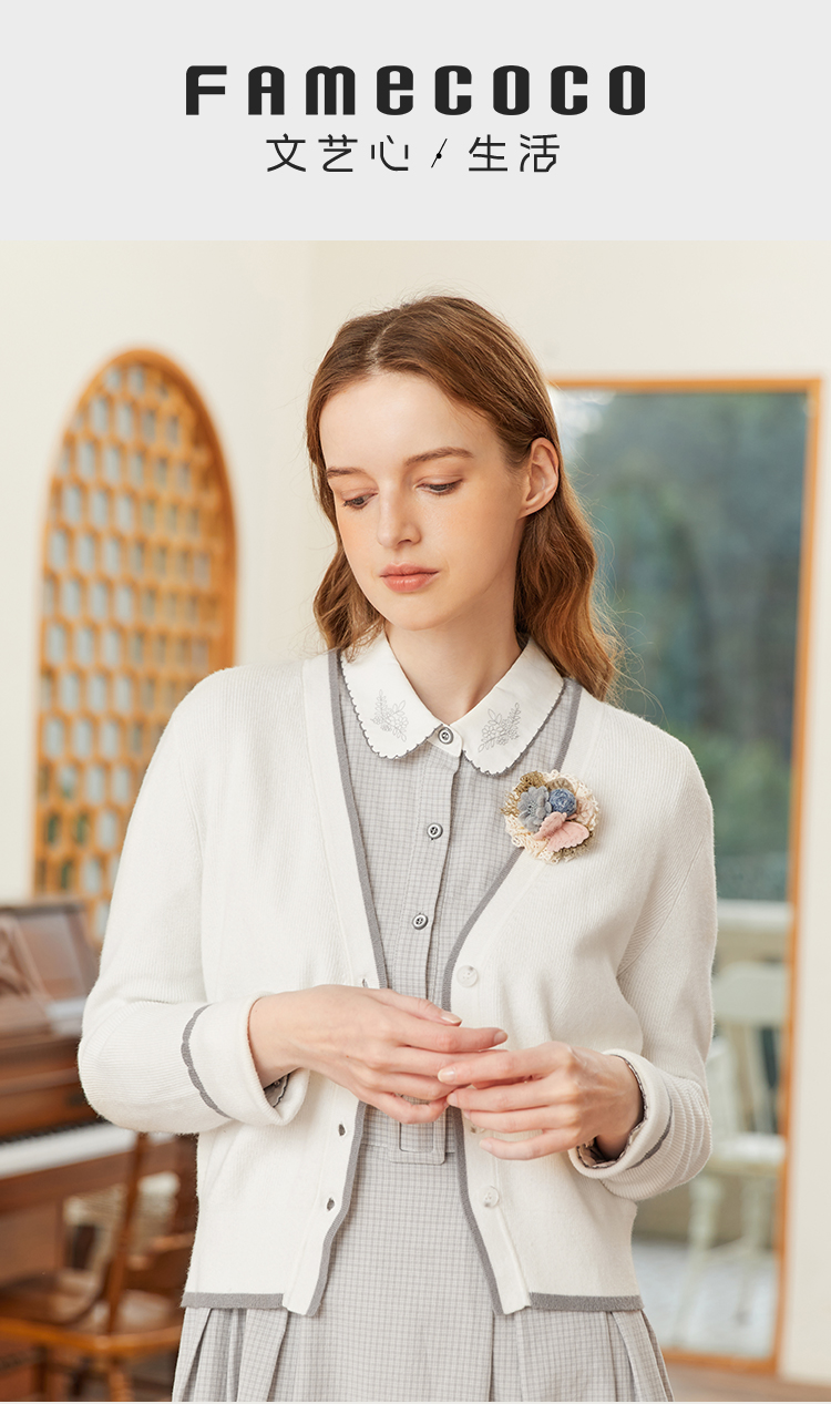famecoco范可儿短毛衣外套女开衫春季撞色边v领针织衫FAB1DE006