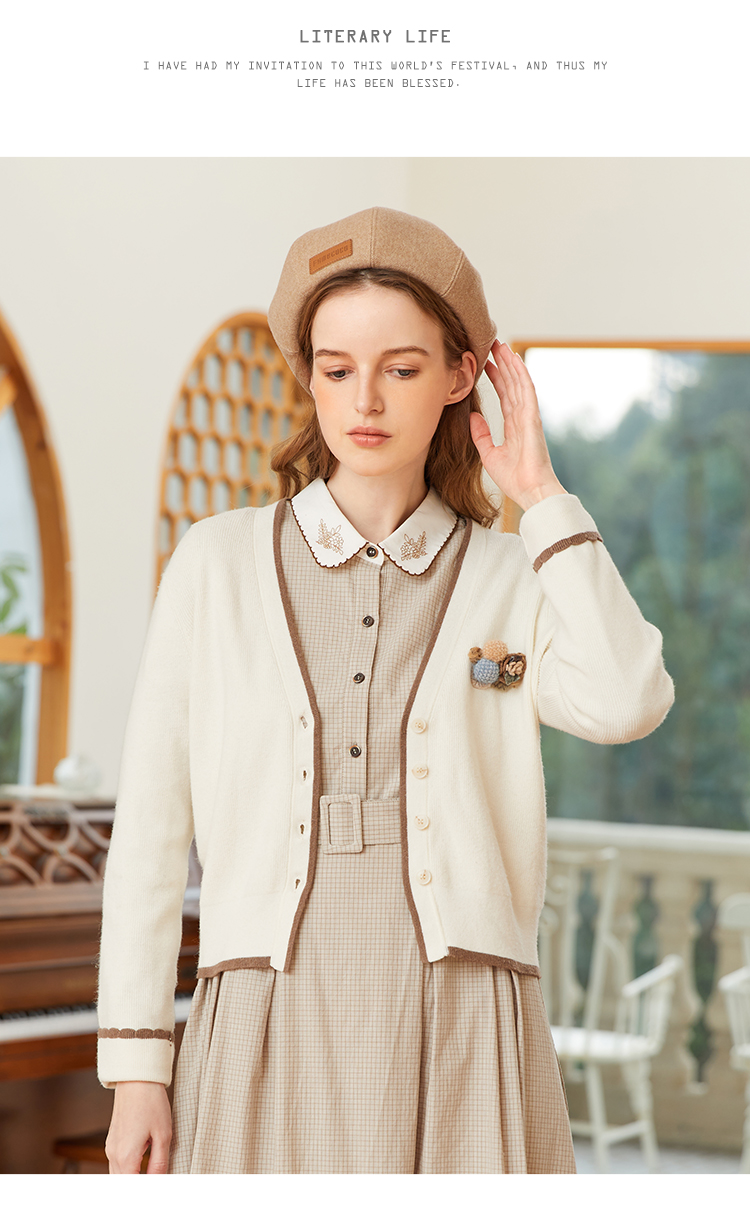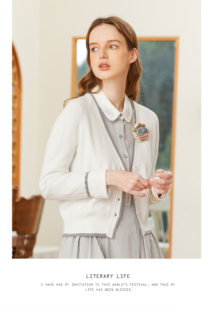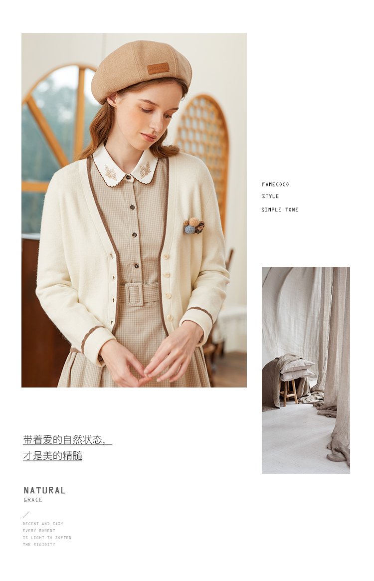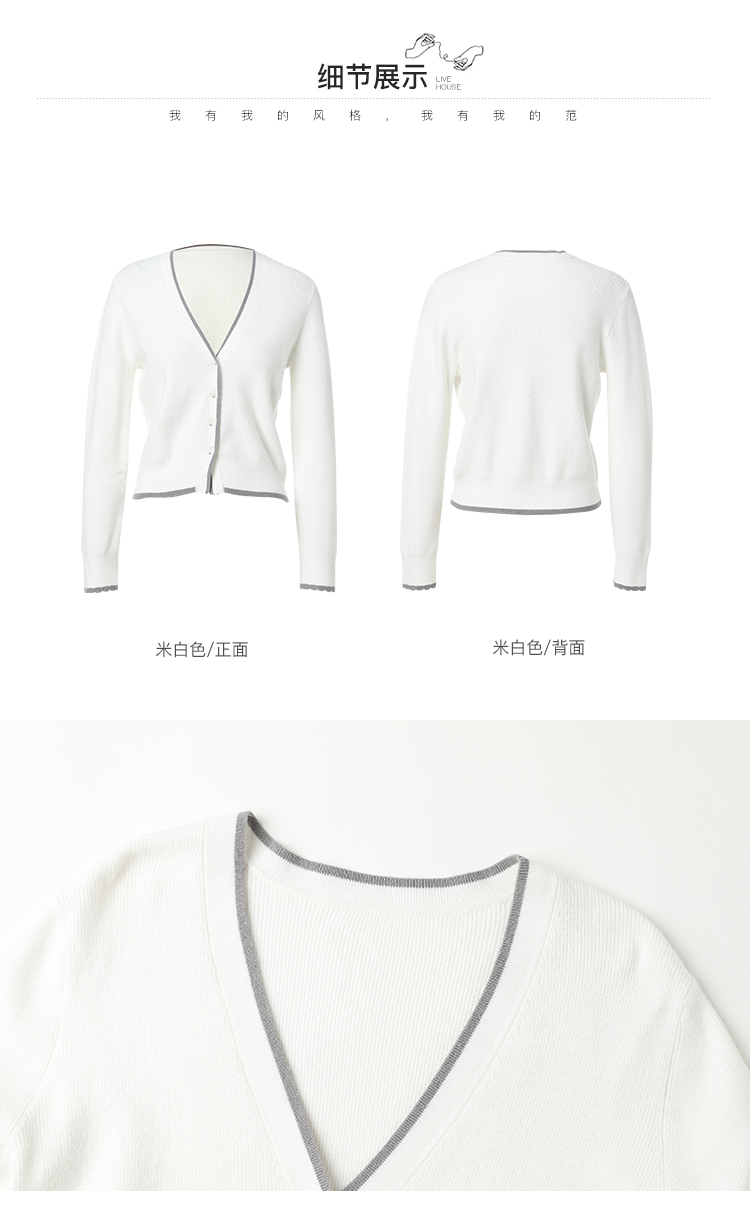 famecoco范可儿短毛衣外套女开衫春季撞色边v领针织衫FAB1DE006