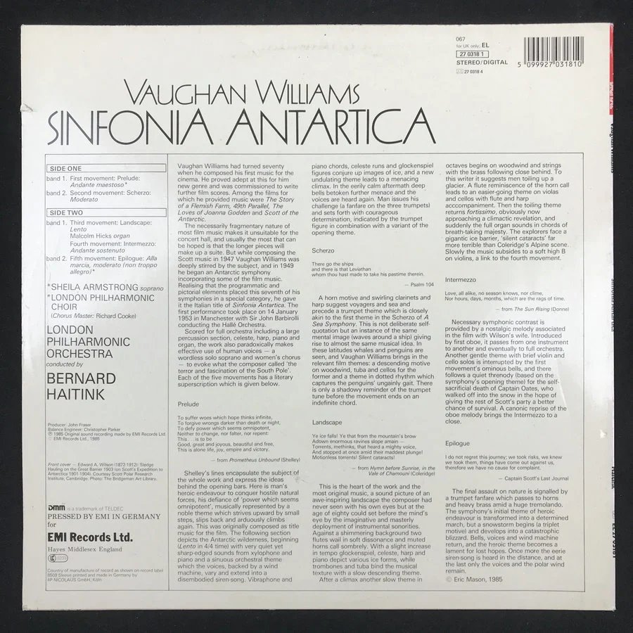 LP黑胶唱片 沃恩·威廉斯《南极交响曲》 伦敦爱乐乐团、伦敦爱乐合唱团 伯纳德·海廷克指挥 女高音:希拉·阿姆斯特朗厂牌:His Master's Voice Digital