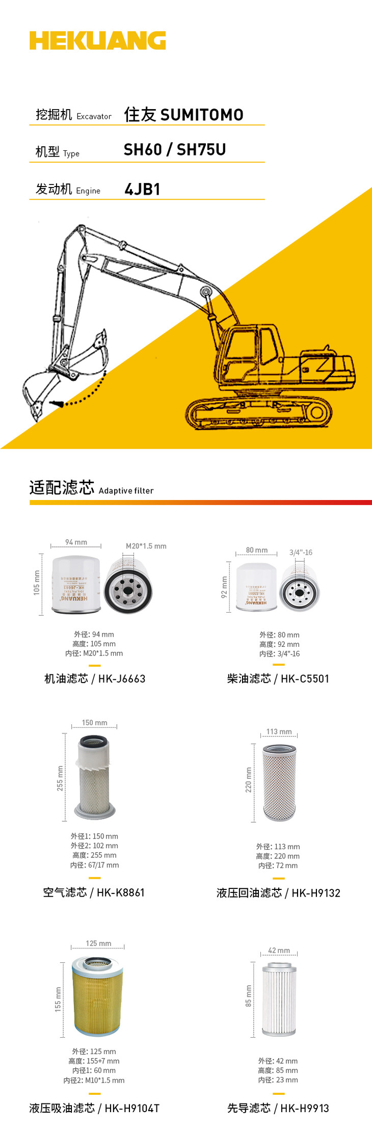 住友SH60 SH75U(4BJ1)挖掘机滤芯 机油柴油空气滤芯 液压油先导滤芯