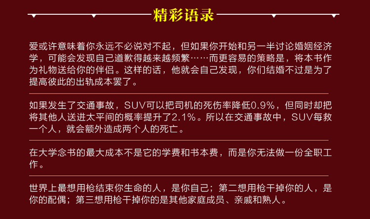 《魔鬼经济学2》作为一本轻快的读物,涉及大量新鲜出炉的事实和让人恍然大悟的思考,比如为什么阴天时,学生更好学?枪支管制可以减少枪击案吗?GDP与心脏病发作规律有着怎样的联系?艾滋病救助与打击恐怖主义有何相同之处?