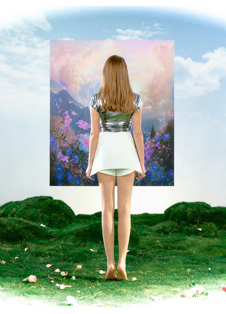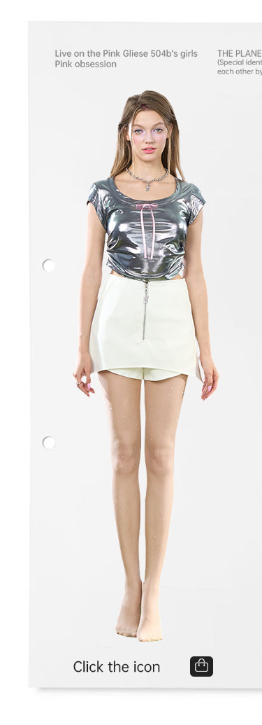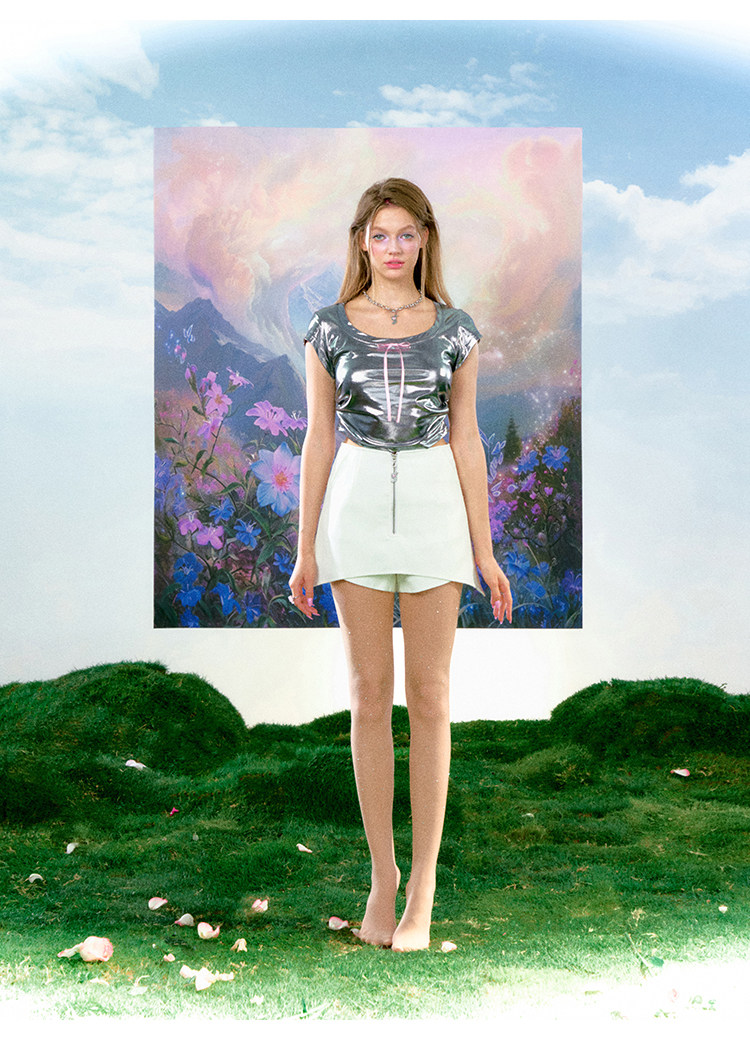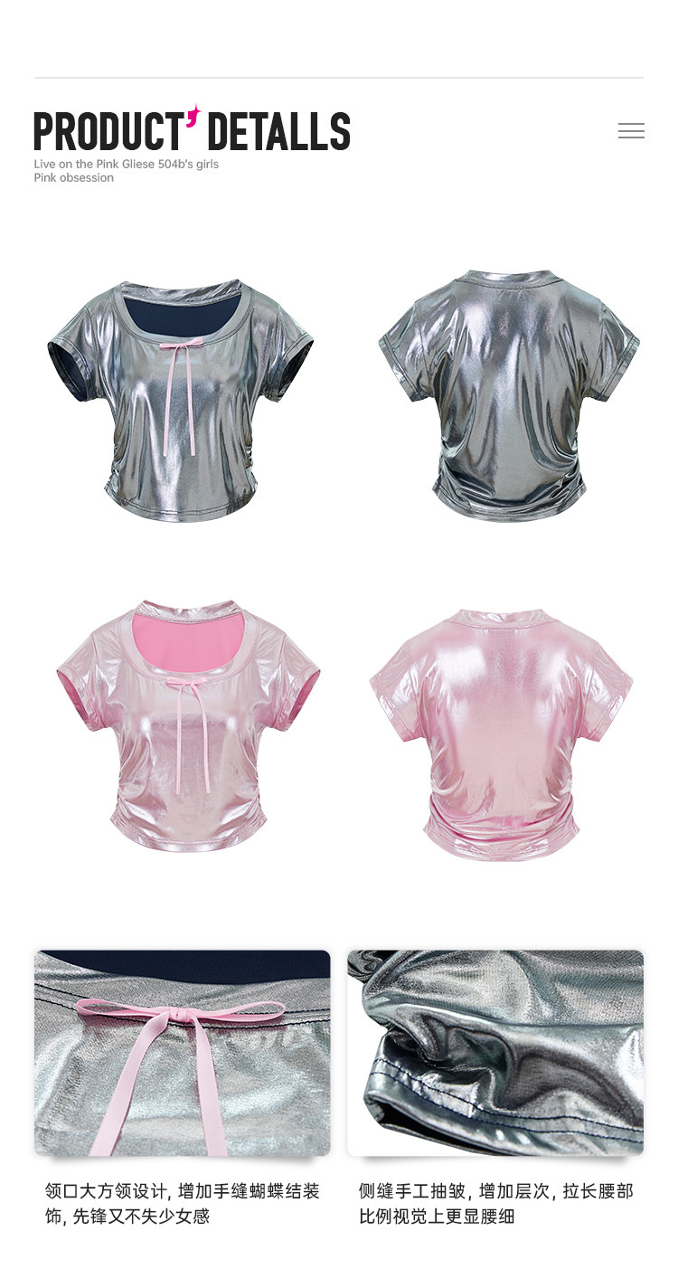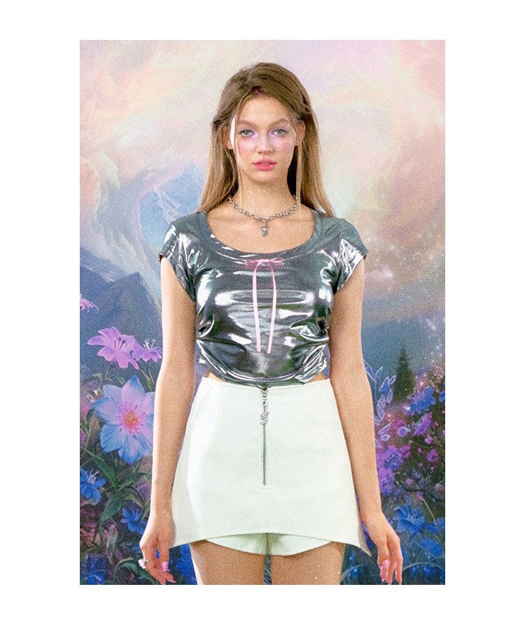 FTT FlyTheTruth 波光 辣妹褶皱亮面短袖T恤女夏季蝴蝶结短款上衣