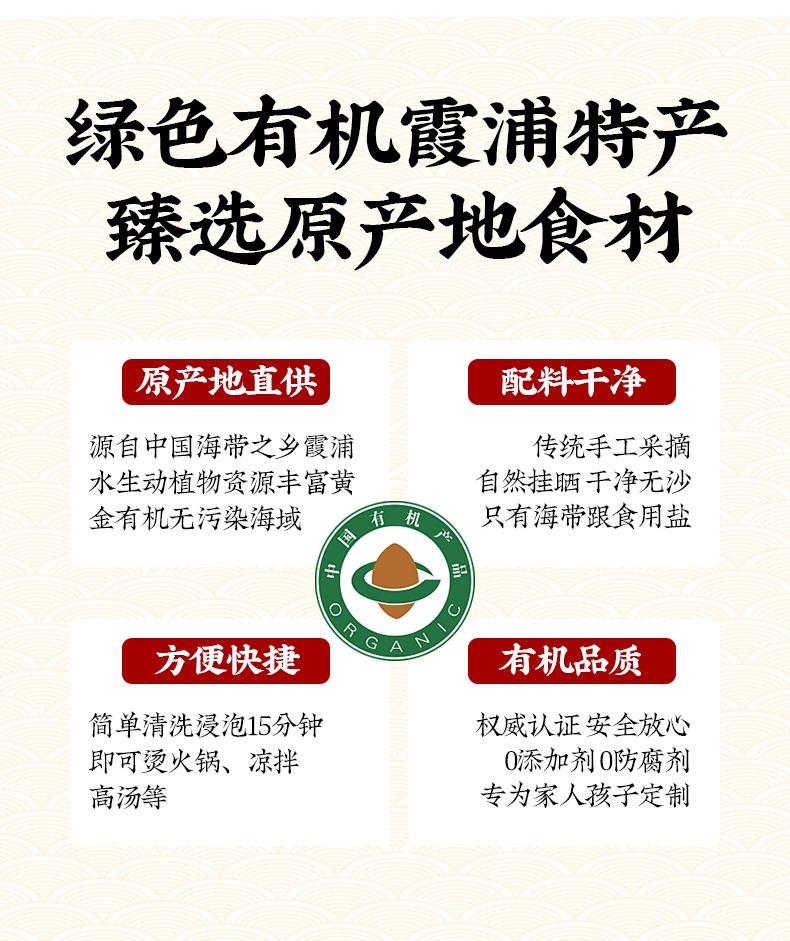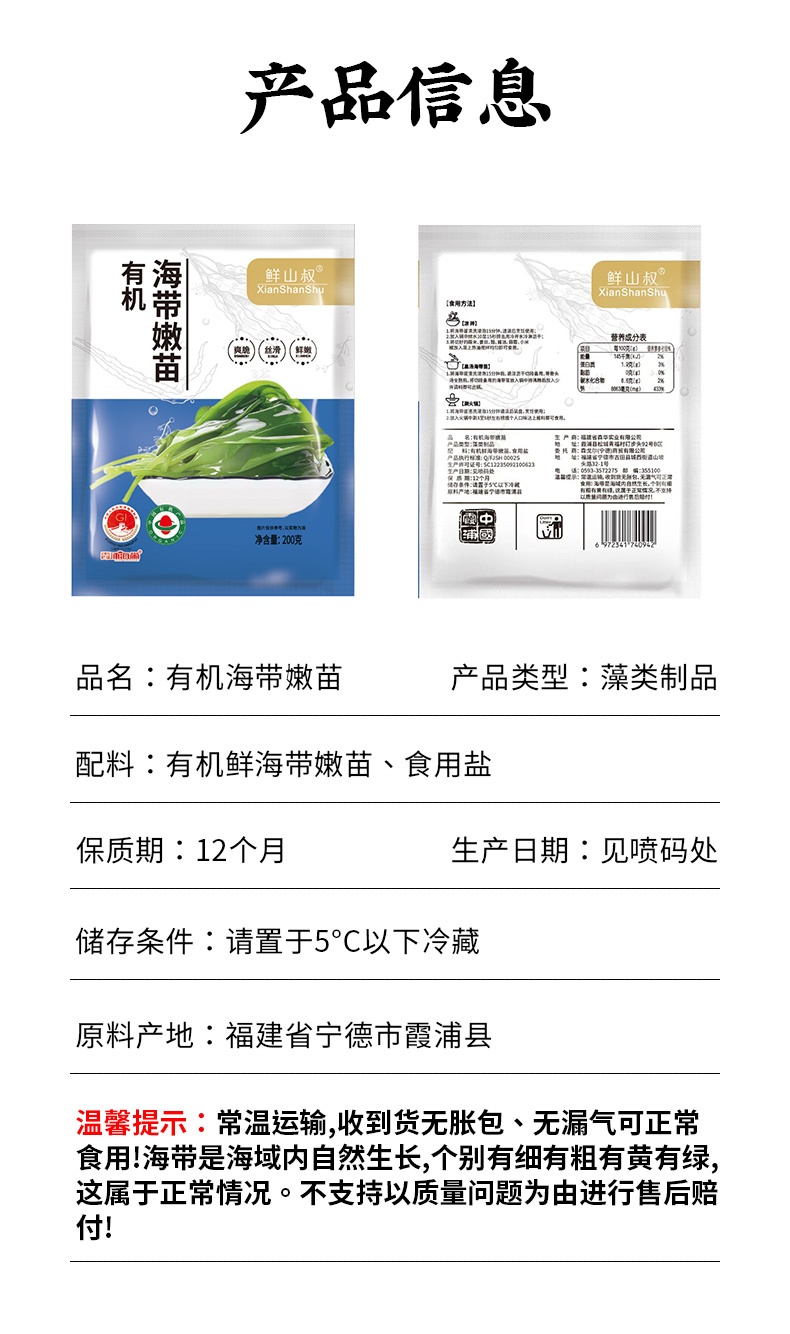 品名:霞浦有机海带嫩苗规格1:200g/袋*5包装:袋装+快递中转 快递:极兔,圆通随机,不指定快递 发货时效:48小时 发货地/产地:福建古田 运费模板:内蒙古+25元;甘肃/青海/宁夏+15元;北京/上海/海南+2元;新疆,西藏,港澳台不发货,其他区域包邮 售卖期:全年 保质期:12个月 周六周天、节假日除外,早上十点之前的订单是48小时发货 ,到货时间约为2-5天,请您耐心等待 |