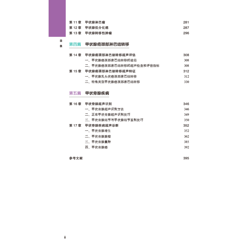 01 特色的超声诊断图谱 本书是 少有的关于甲状腺及甲状旁腺结节的超声诊断图谱。全书共五篇17 个章节,分为总论、甲状腺良性疾病、甲状腺恶性疾病、甲状腺癌颈部淋巴结转移、甲状旁腺疾病,并附1200 余幅实例图片。