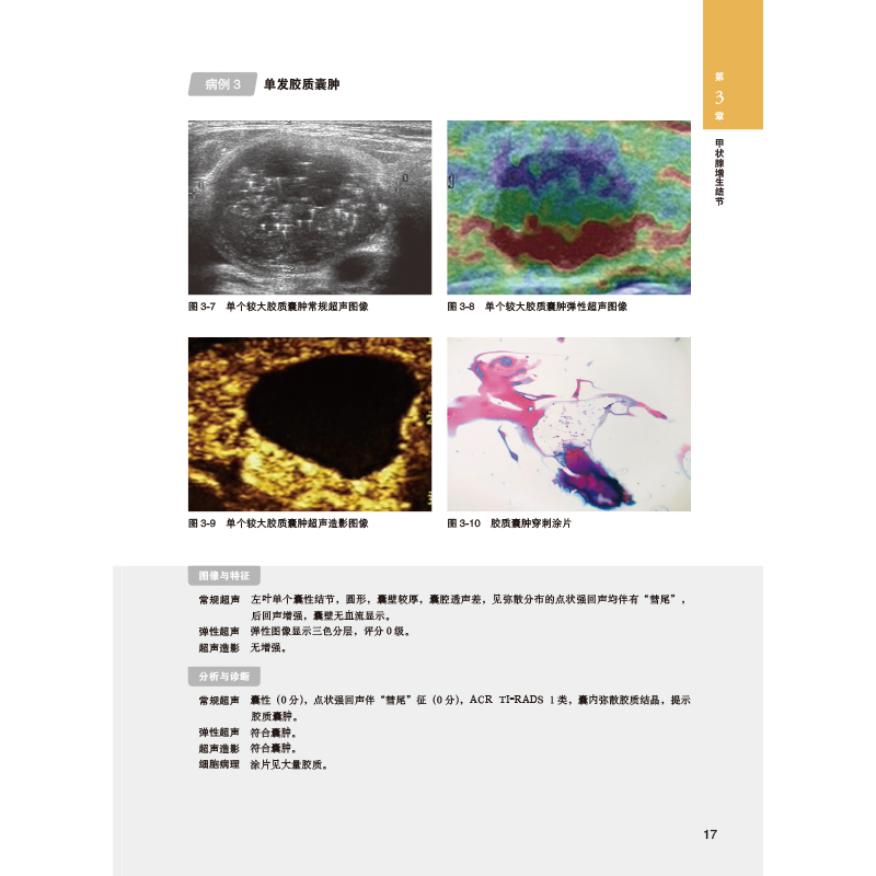 03 多种超声技术联合分析 《甲状腺及甲状旁腺结节超声诊断图谱》详细论述了甲状腺结节超声评估指标与TI-RADS 分类方法,简明介绍了正常甲状旁腺超声识别的方法与技巧,重点阐述了联合应用常规超声、弹性超声及超声造影技术对甲状腺及甲状旁腺各类良、恶性结节的诊断价值, 大多数病例附有细胞病理或组织病理诊断结果对照。