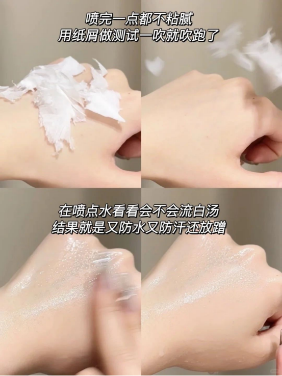 喷头细腻均匀,喷雾如轻薄的雾气般轻柔, 上身轻薄,轻轻推开,延展性非常好, 也不会搓泥,成膜速度快,清爽不油腻, 也没有厚重感,仿佛没有涂过任何东西! 别看它是美白防晒喷雾,上身完全不假白, 而且防水防汗也很牛,出汗之后不会流白汤!