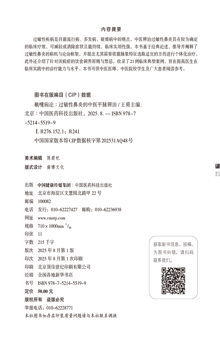 鼽嚏病论 过敏性鼻炎的中医平脉辨治 王勇 主编 可供中医医师、中医院校学生及广大患者阅读参考 9787521455199中国医药科技出版社