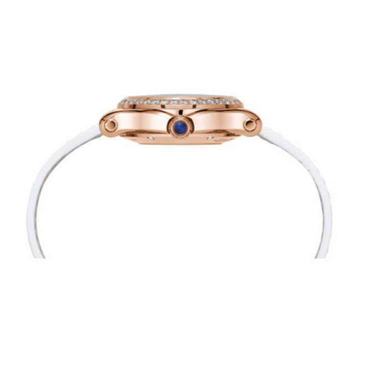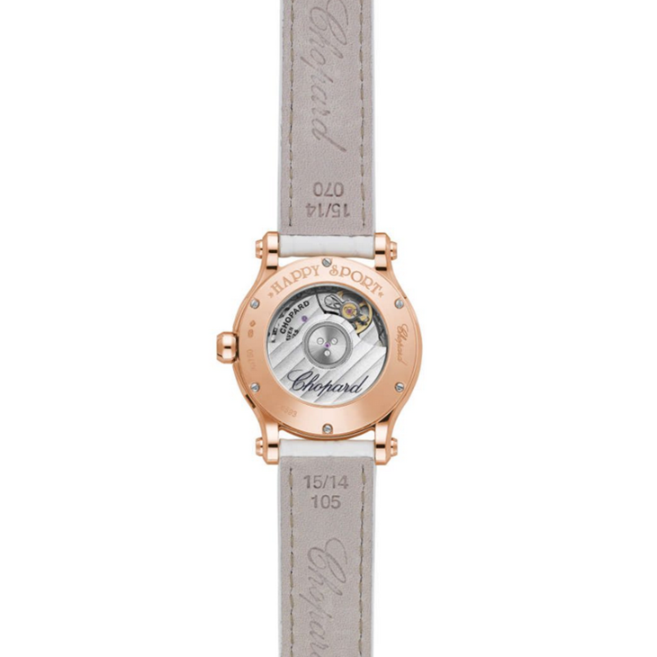 镜面材质 | 蓝宝石水晶玻璃 | 表盘 | 18K玫瑰金镶钻表壳 凹凸质感珍珠贝母表盘 罗马文及条形时标,5钻,钻石1.26克拉 背透,开放式表底盖通过螺丝固定,带有Happy Sport标志和防眩光蓝宝石水晶镜面 |