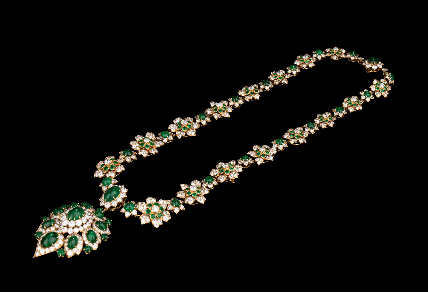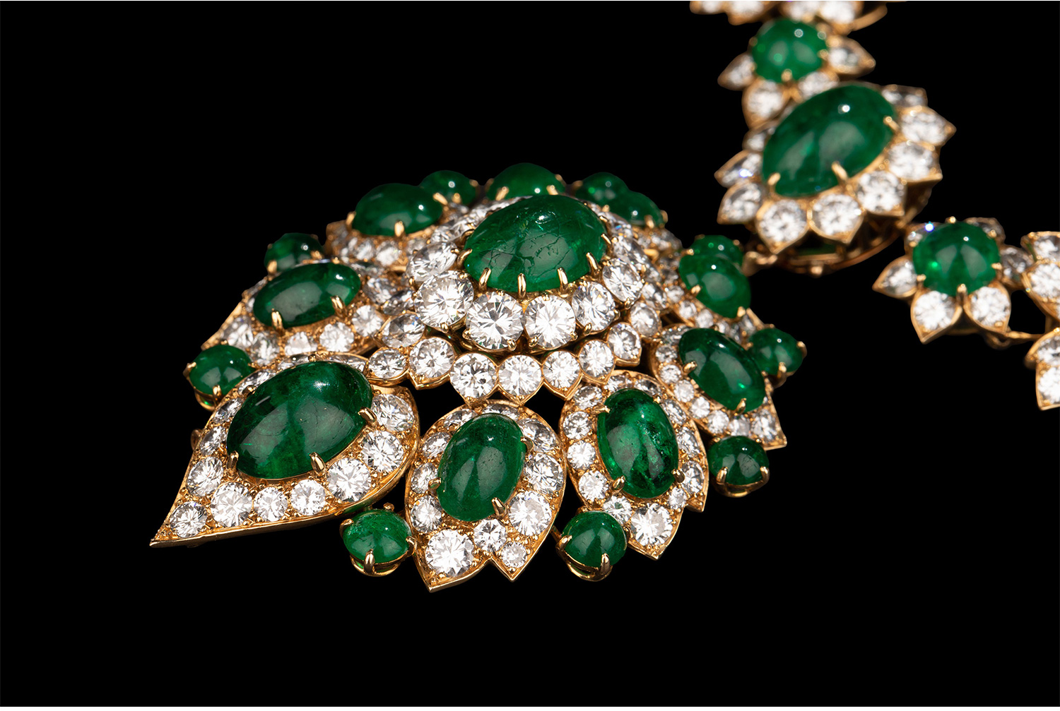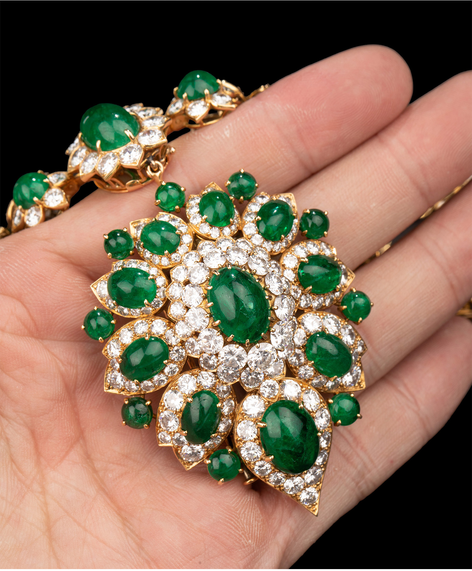 1970年代法国出品18K黄金镶嵌钻石及祖母绿可拆卸式项链/胸针