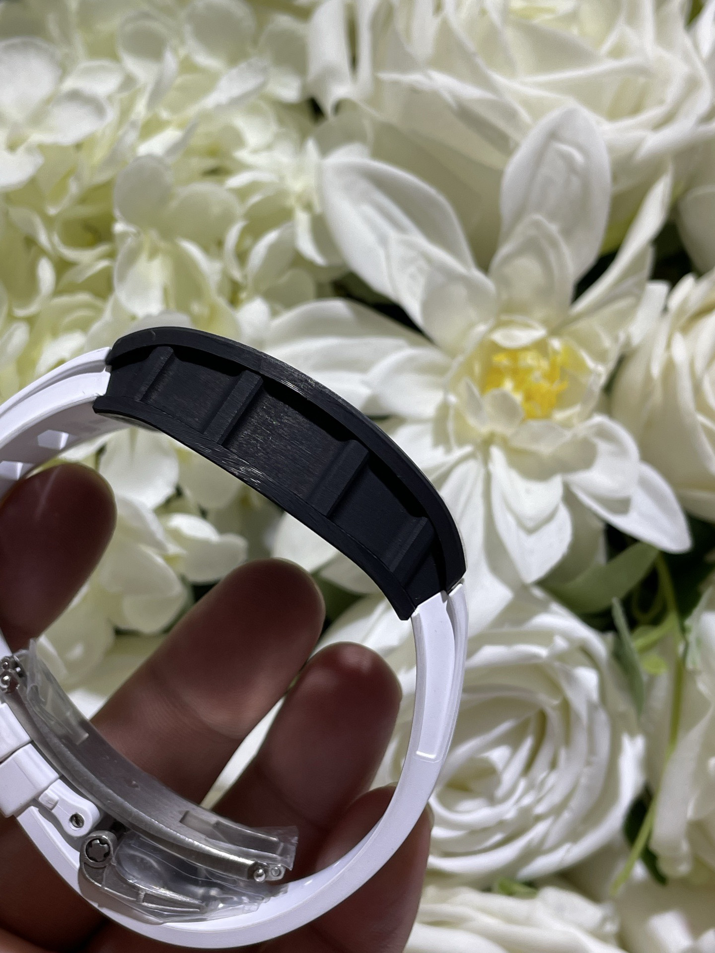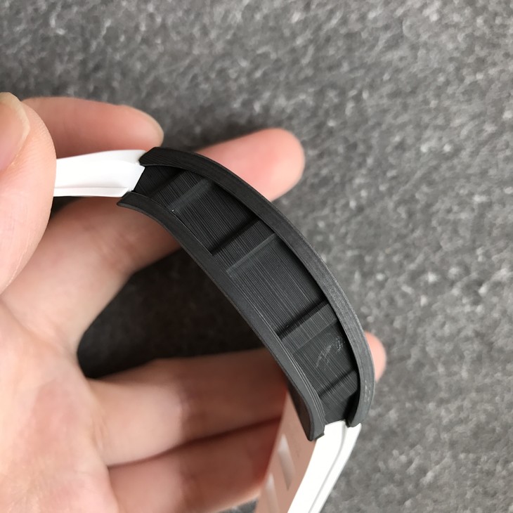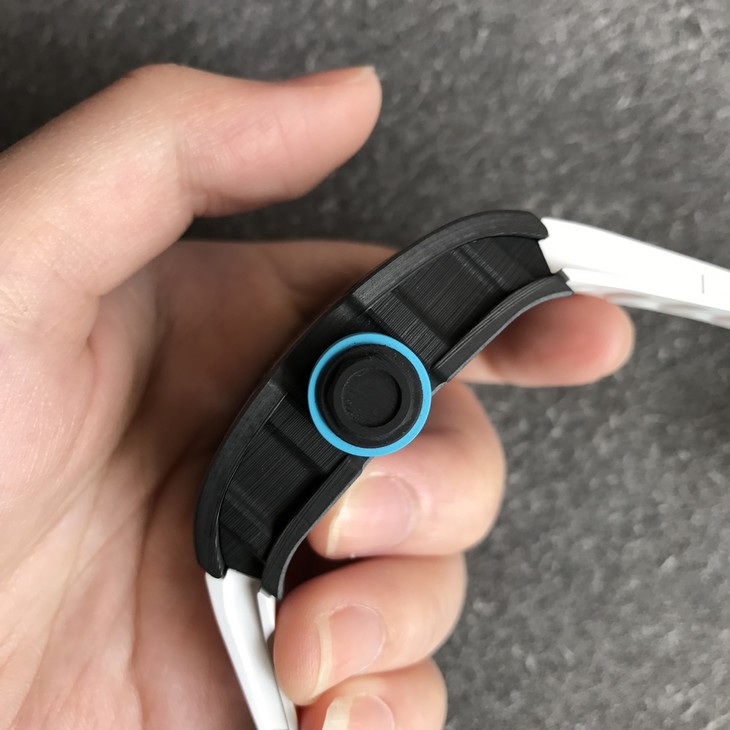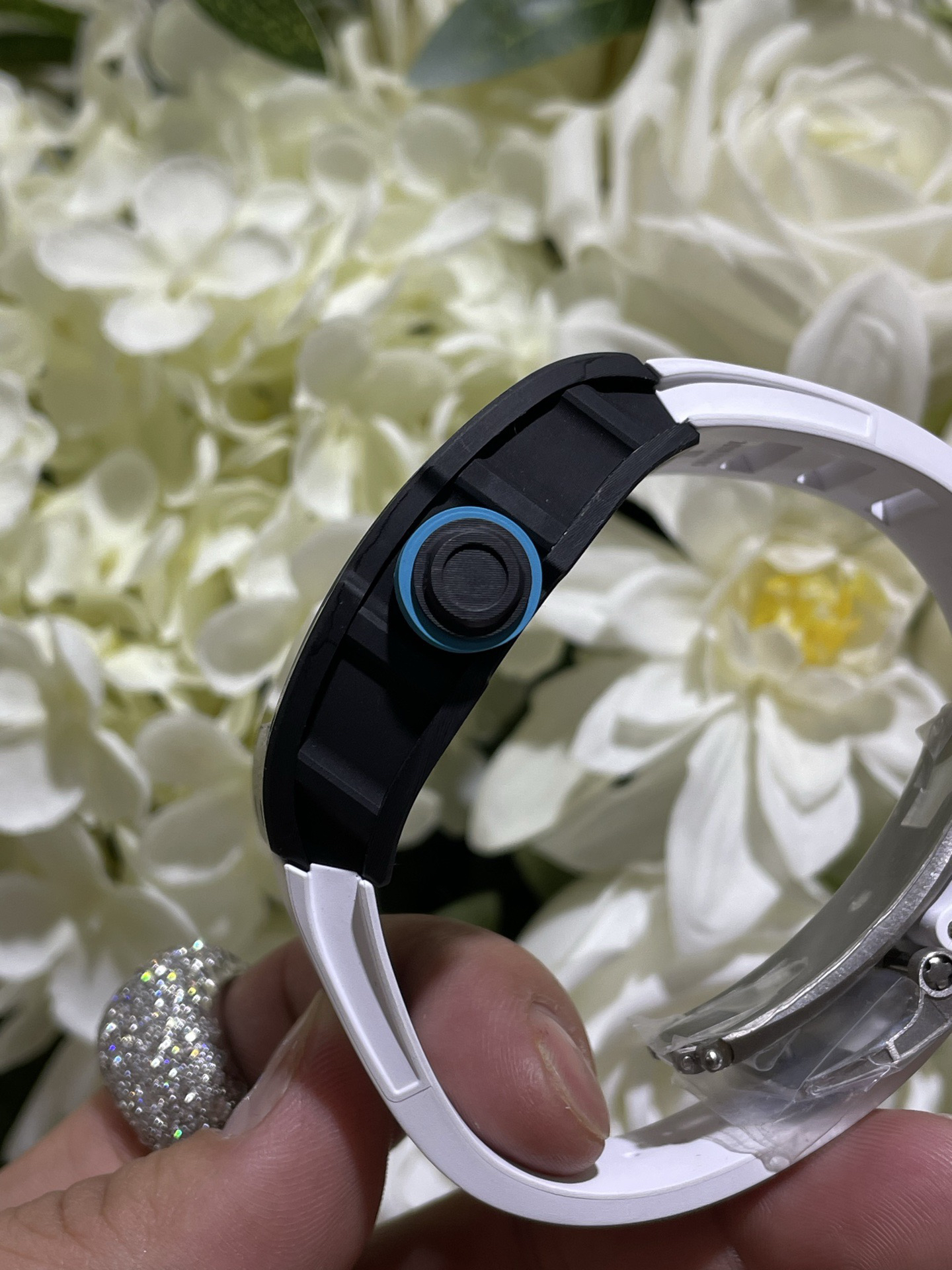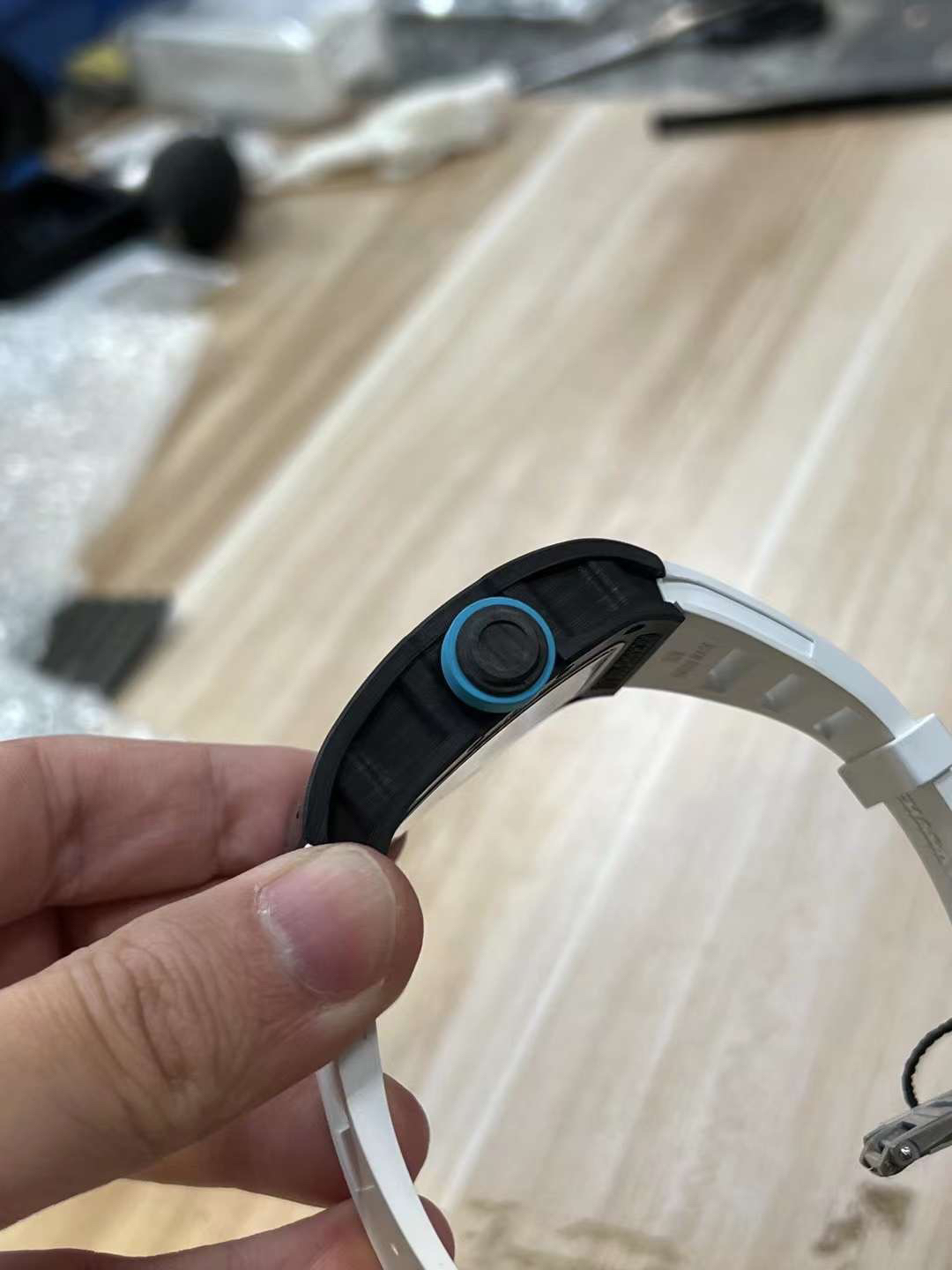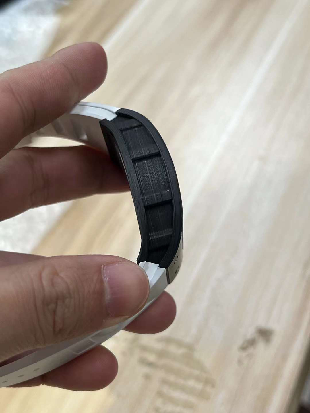 表壳由微细喷砂处理的碳素(NTPT)打造,NTPT是理查德米勒最经典的特殊材质。特点是重量轻,碳素硬度高经得起极端环境的考验。