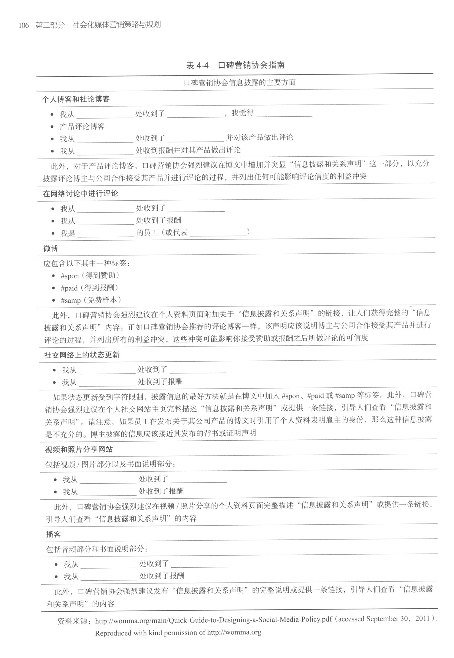 第三,本书给出了“so what”,即如何根据网络用户的心理行为特征开展社会化媒体营销活动?第4章描述了社会化媒体营销策略,第5章探讨了战术计划和执行。第6~9章分别从社会化社区、社会化发布、社会化娱乐和社会化商务这四个方面具体阐述了营销策略和行动要点。例如,品牌基于自有、免费和付费媒体这三种社会化网络社区进行品牌宣传的策略,社会化发布的内容开发策略,基于搜索引擎的站内、站外优化策略,社会化娱乐中常用的产品植入、品牌整合、社会化视频、音乐等策略,以及社会化商务的推荐策略,等等。