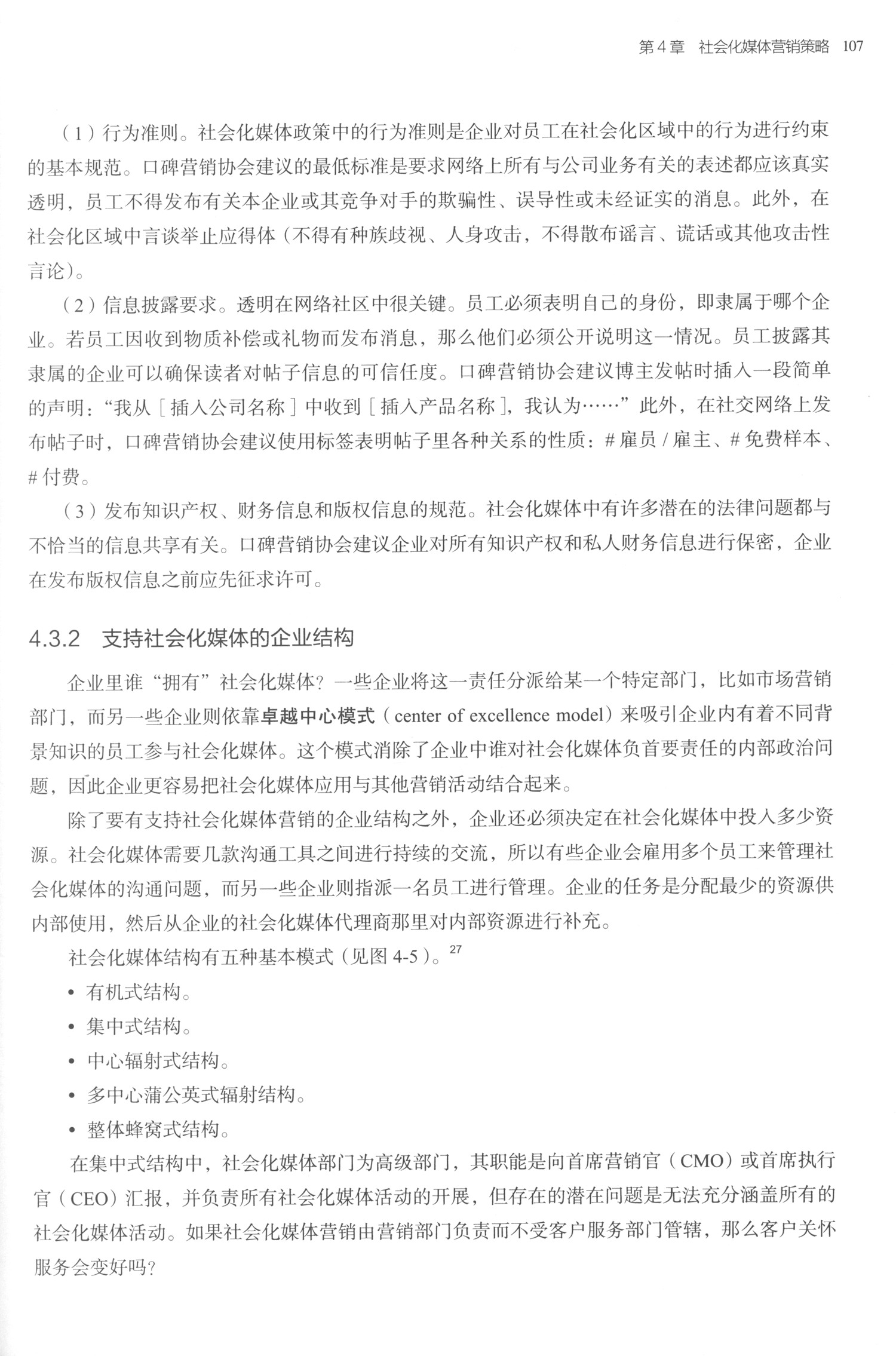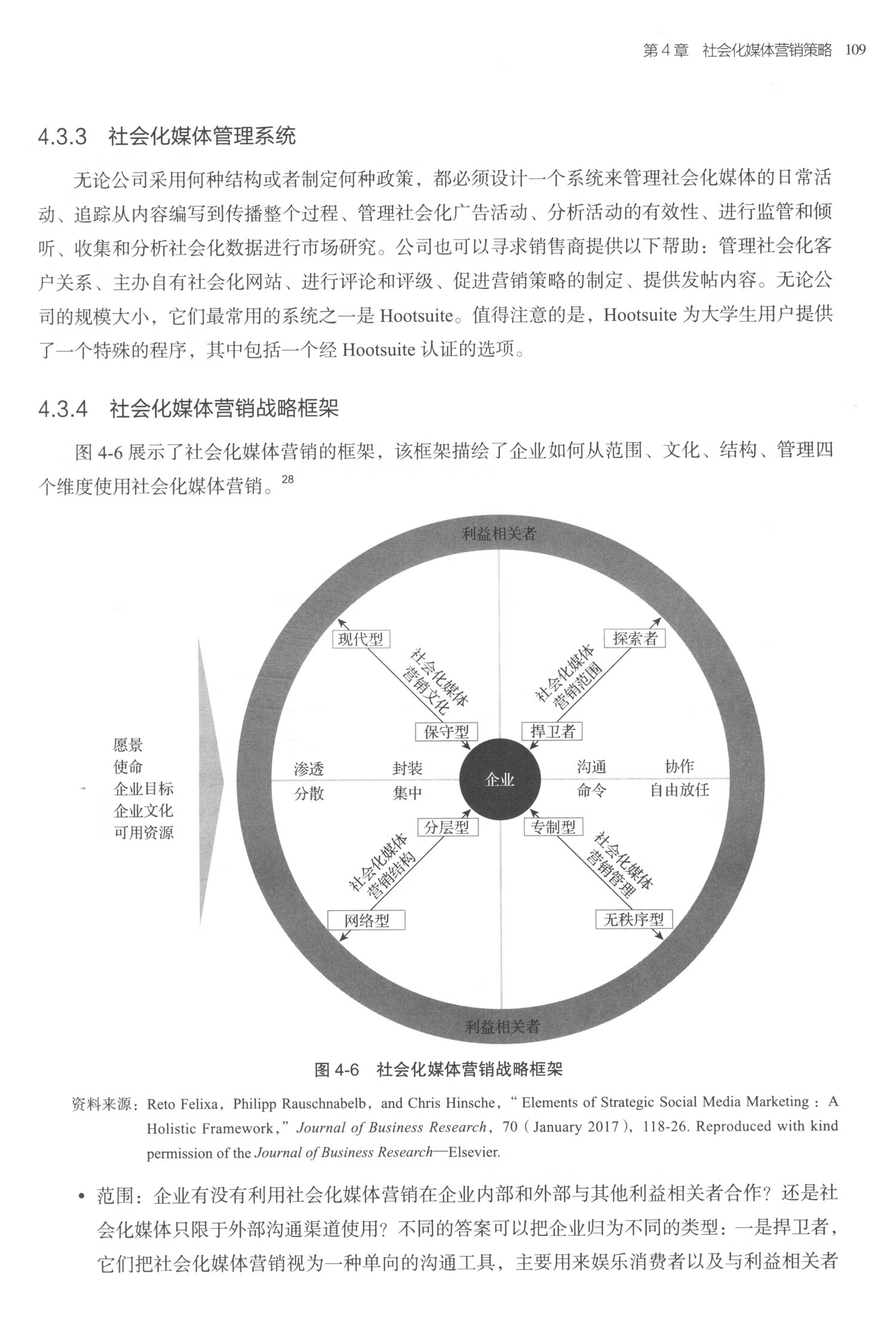 第一,本书回答了“what”,即什么是社会化媒体营销?它主要包括哪些营销活动?正如作者在第1章所引述的,社会化媒体通过其技术能力和移动性来增强人与人之间、社区和组织之间互联互依的网络体系,促进它们之间的交流、信息传播、相互协作与关系培养。社会化媒体营销就是利用社会化媒体技术、渠道和软件来创造、交流、传送和交换对组织利益相关者而言有价值的产品,具体包括社会化社区、社会化发布、社会化娱乐和社会化商务四类区域的营销活动。