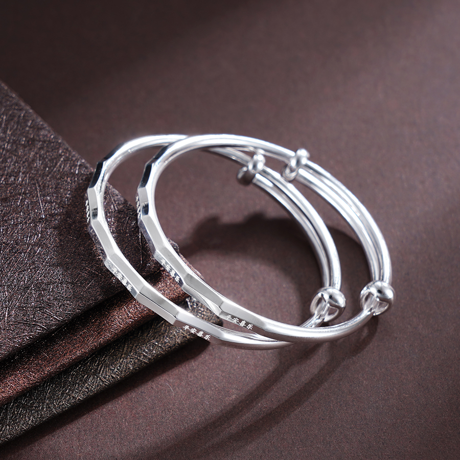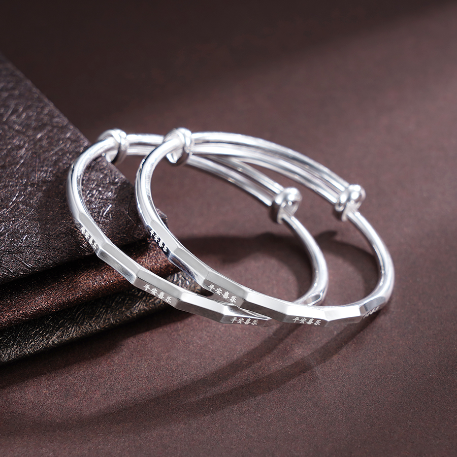 【寓意】:一款细腻的纯银童镯,通体抛光打磨,呵护宝宝细嫩肌肤。童镯表面点缀“平安喜乐”四字,寓意平安喜乐,幸福相伴。