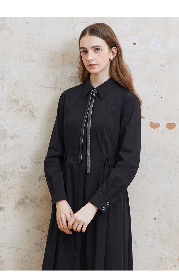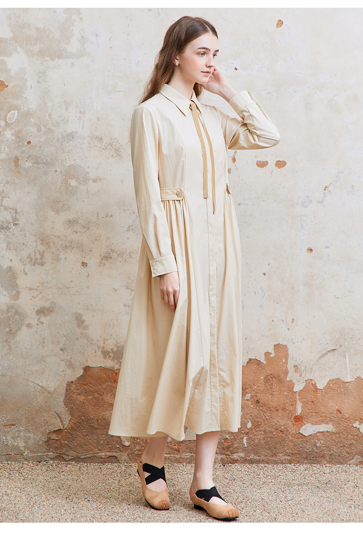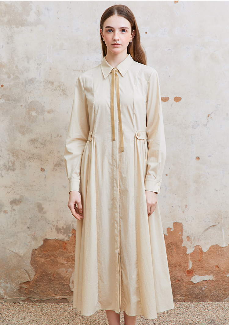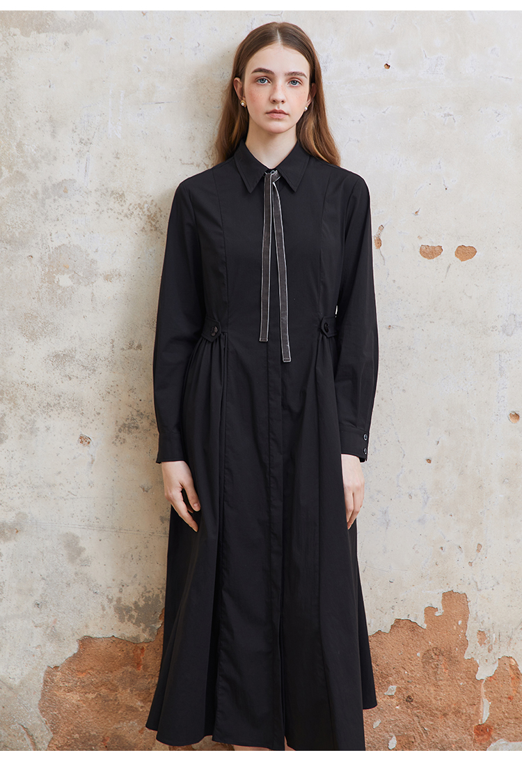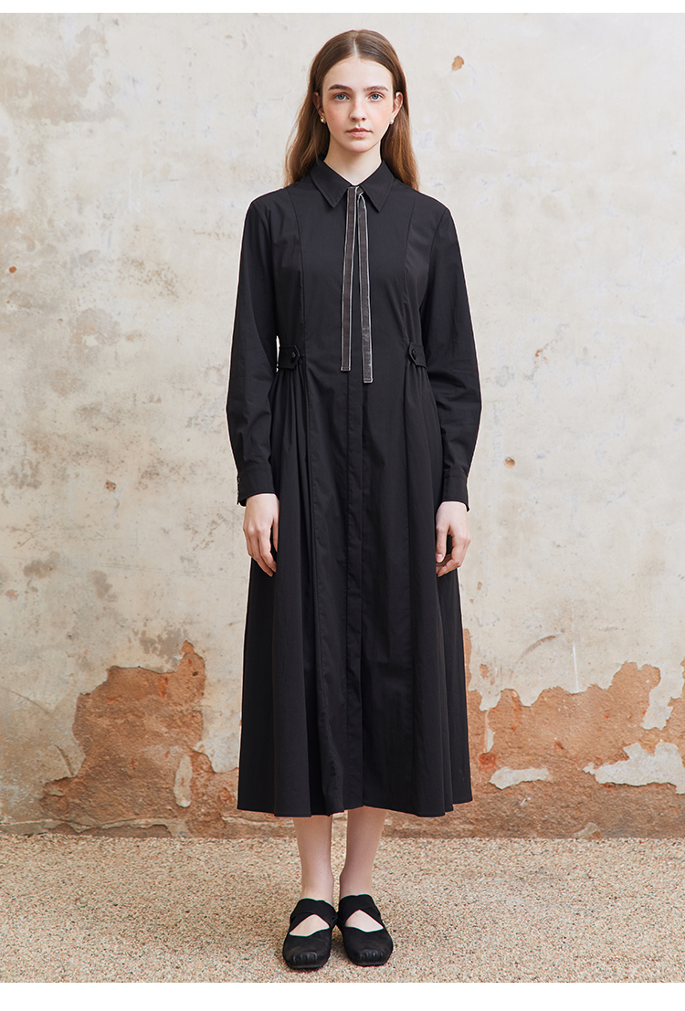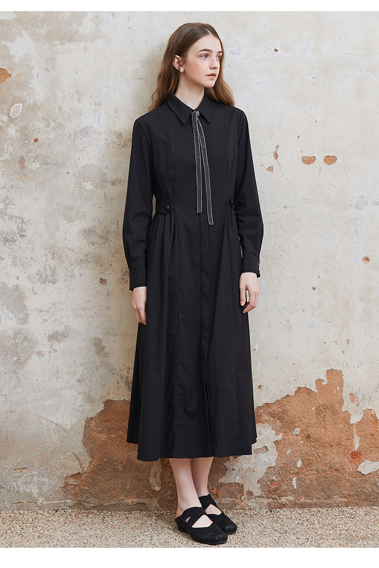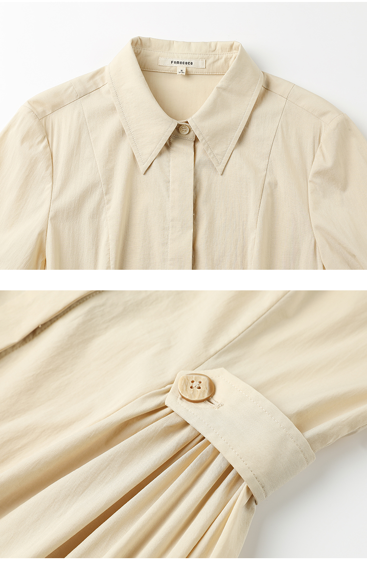 Famecoco范可儿捏褶长袖衬衫裙女士过膝长款连衣裙FAC1FA023