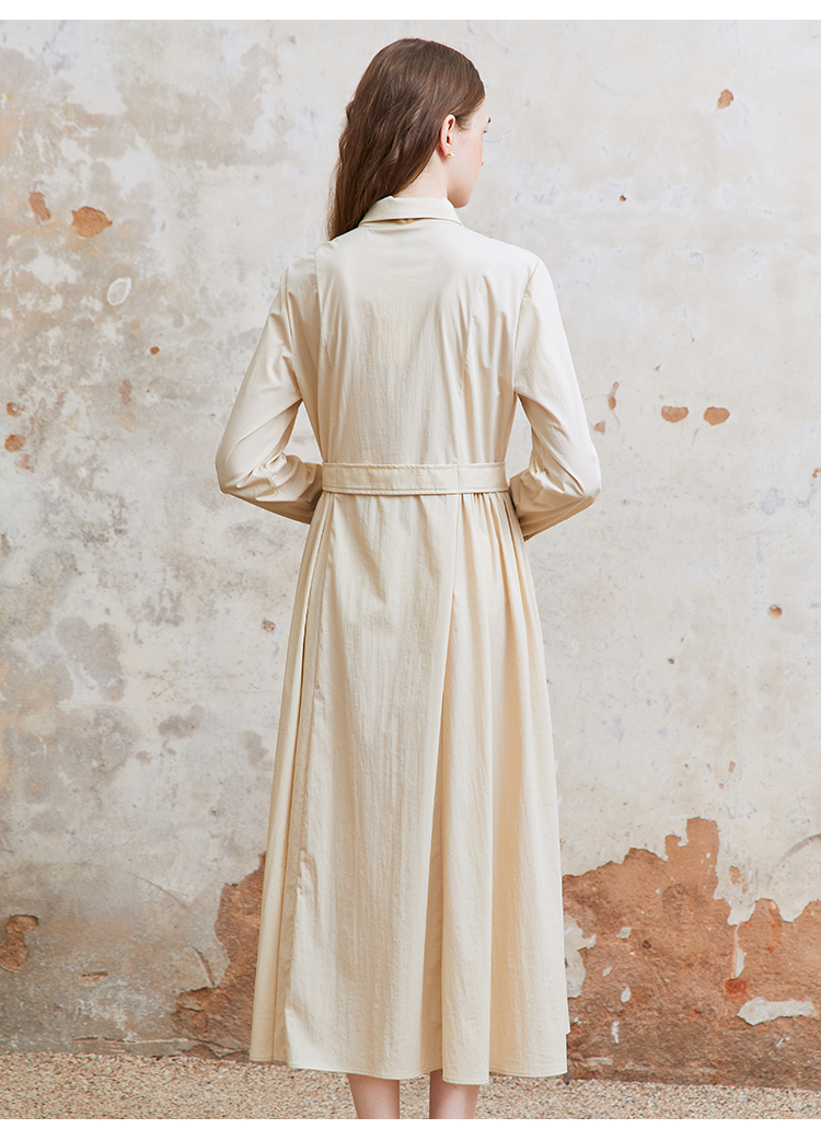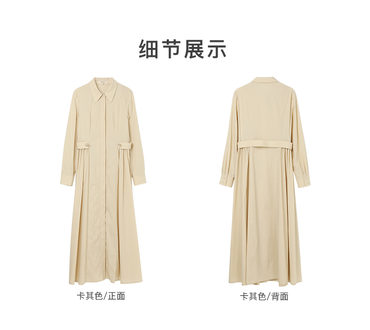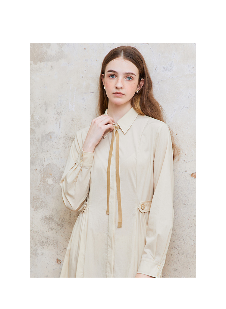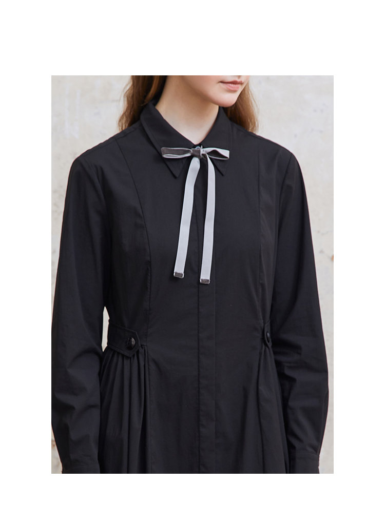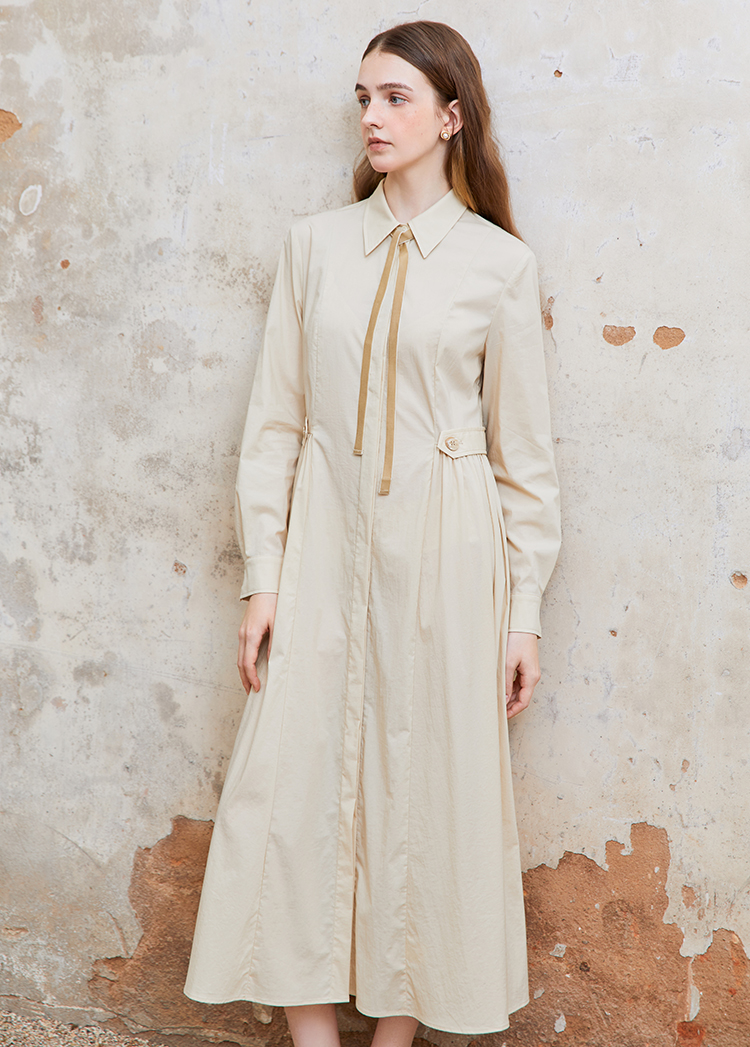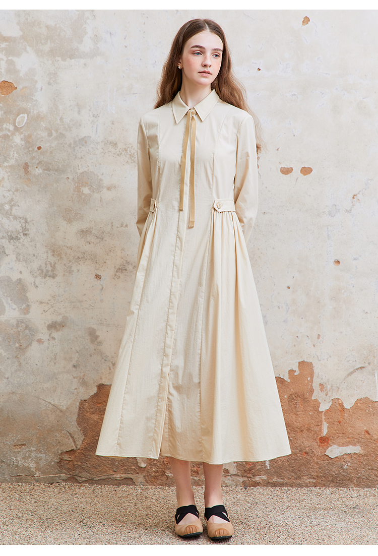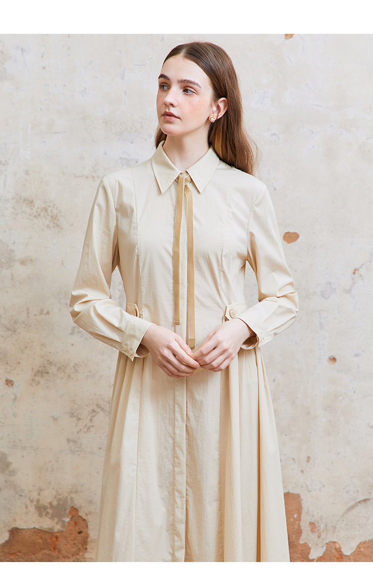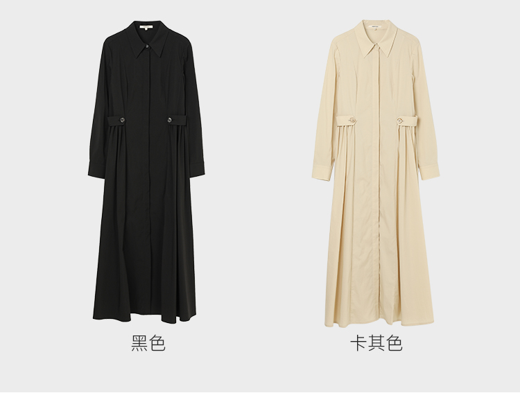 Famecoco范可儿捏褶长袖衬衫裙女士过膝长款连衣裙FAC1FA023