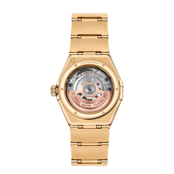 镜面材质 | 蓝宝石水晶玻璃 | 表盘 | 黄色18K金腕表,表圈铺镶钻石 香槟色太阳纹饰表盘饰有钻石小时刻度,6点钟位置设有日历窗口。表链、指针、欧米茄品牌标识、星座徽标以及钻石托槽亦以黄色18K金打造而成。 透底 |