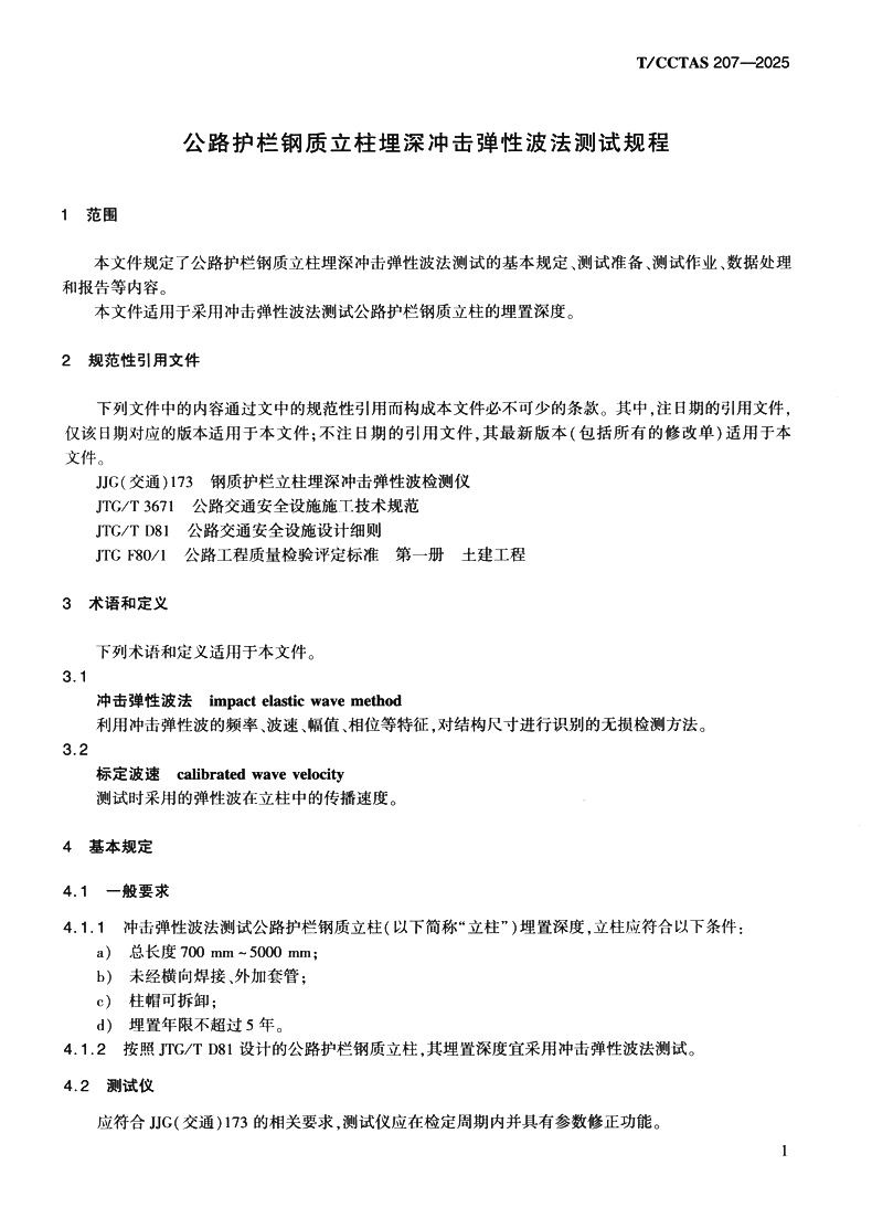 书名:公路护栏钢质立柱埋深冲击弹性波法测试规程T/CCTAS 207—2025