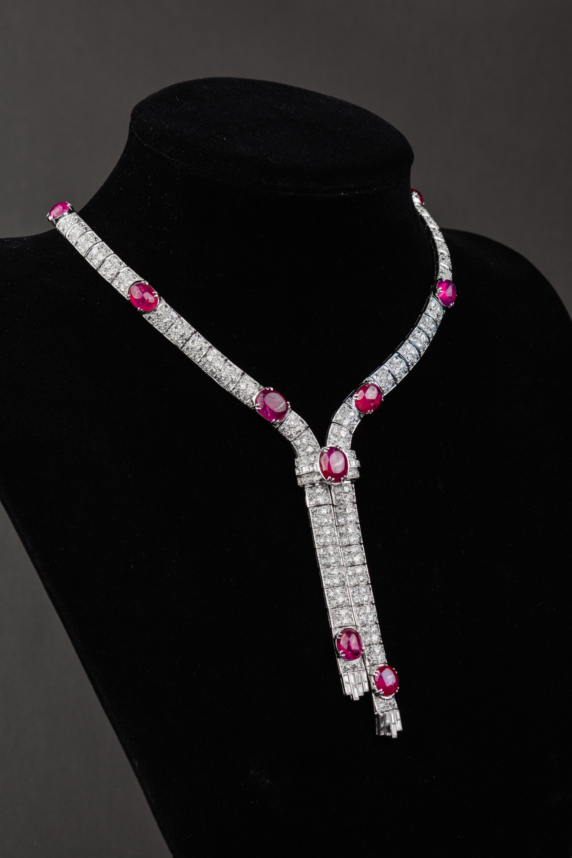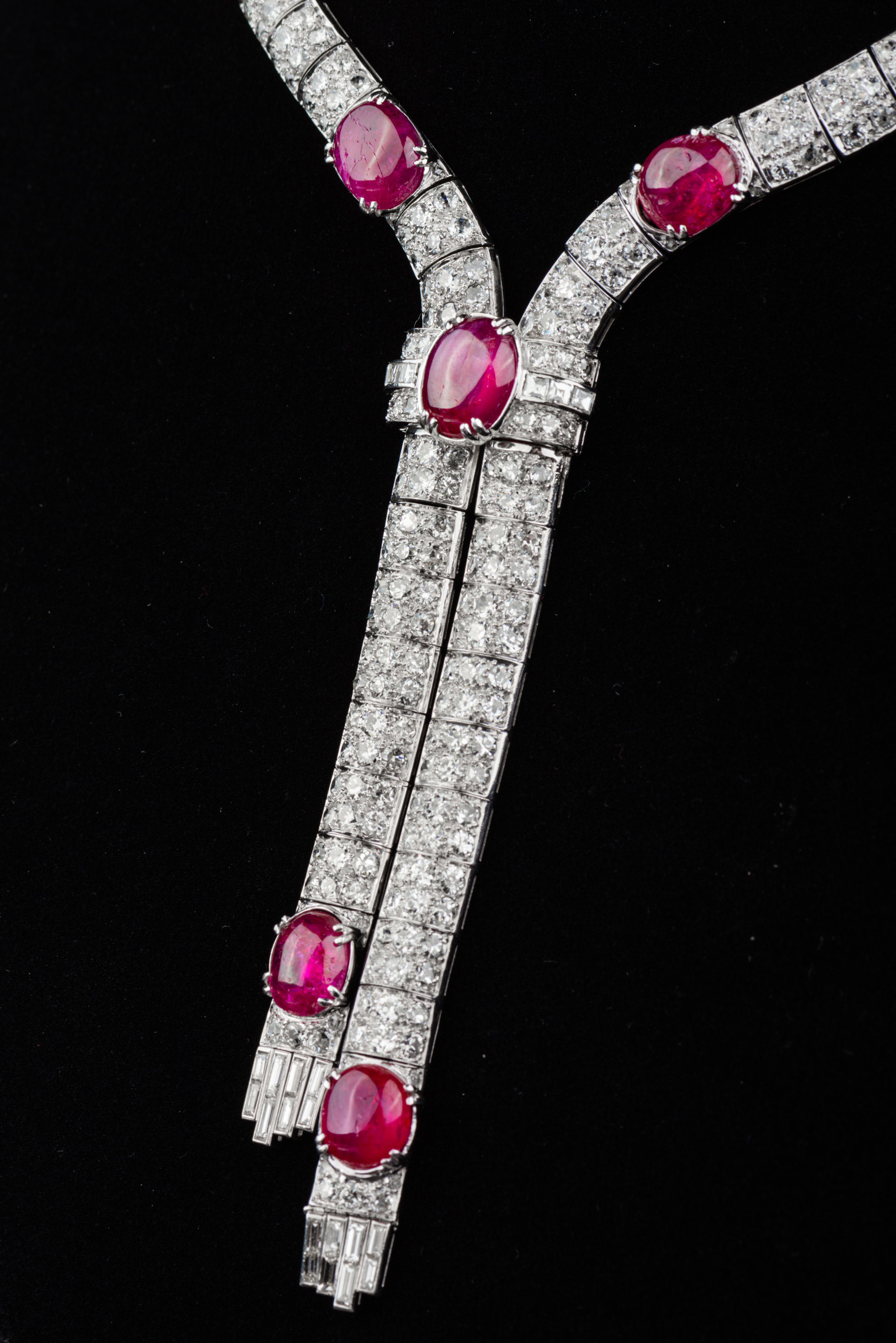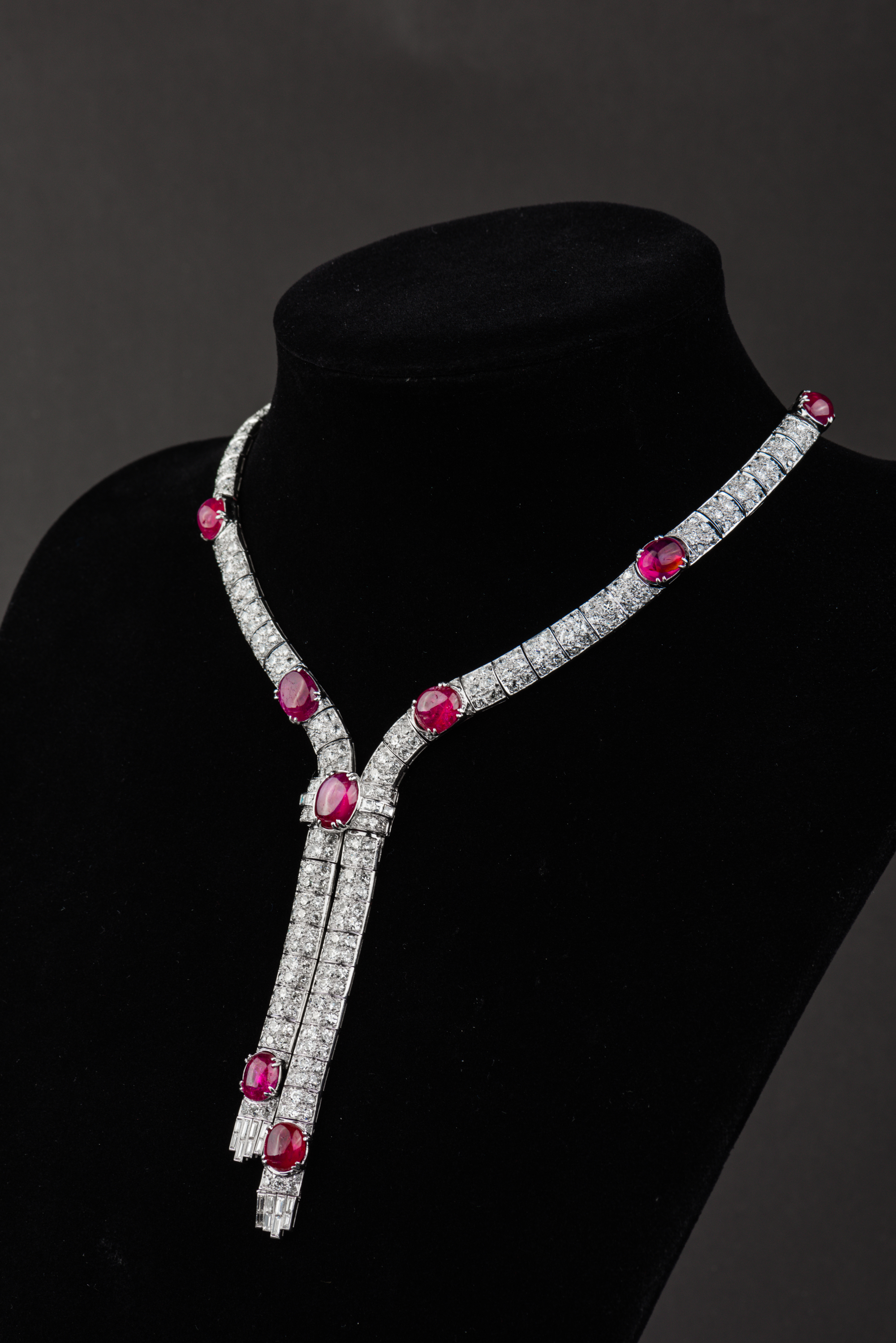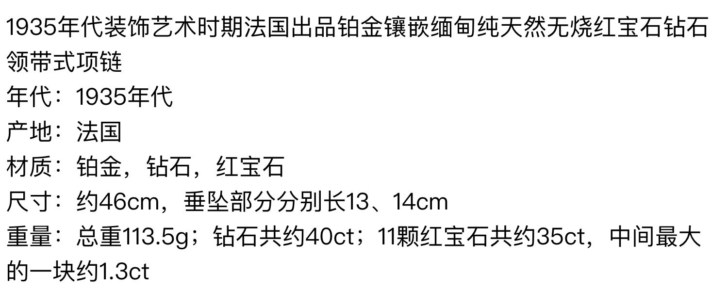 独角鹿西洋古董珠宝首饰法国铂金镶缅甸无烧红宝石钻石领带式项链